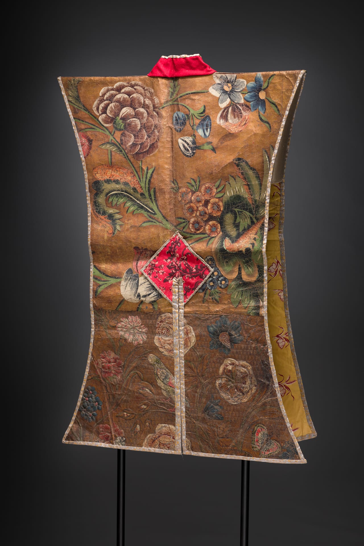Such a wealth of interaction naturally leaves plenty of room for creative misunderstanding. Dutch embossed leather wall coverings marketed in Japan, it turns out, made a fine material for Jinbaori, vest-like surcoats worn by nobles and samurai. The Empress Maria Theresa of Austria, for her part, had a room in her palace decorated with hundreds of Persian miniatures. Created as single sheets meant for albums, the miniatures were collaged into Rococo panels by a Western artist, the disjunctions between the scenes artfully concealed under painted shrubbery.