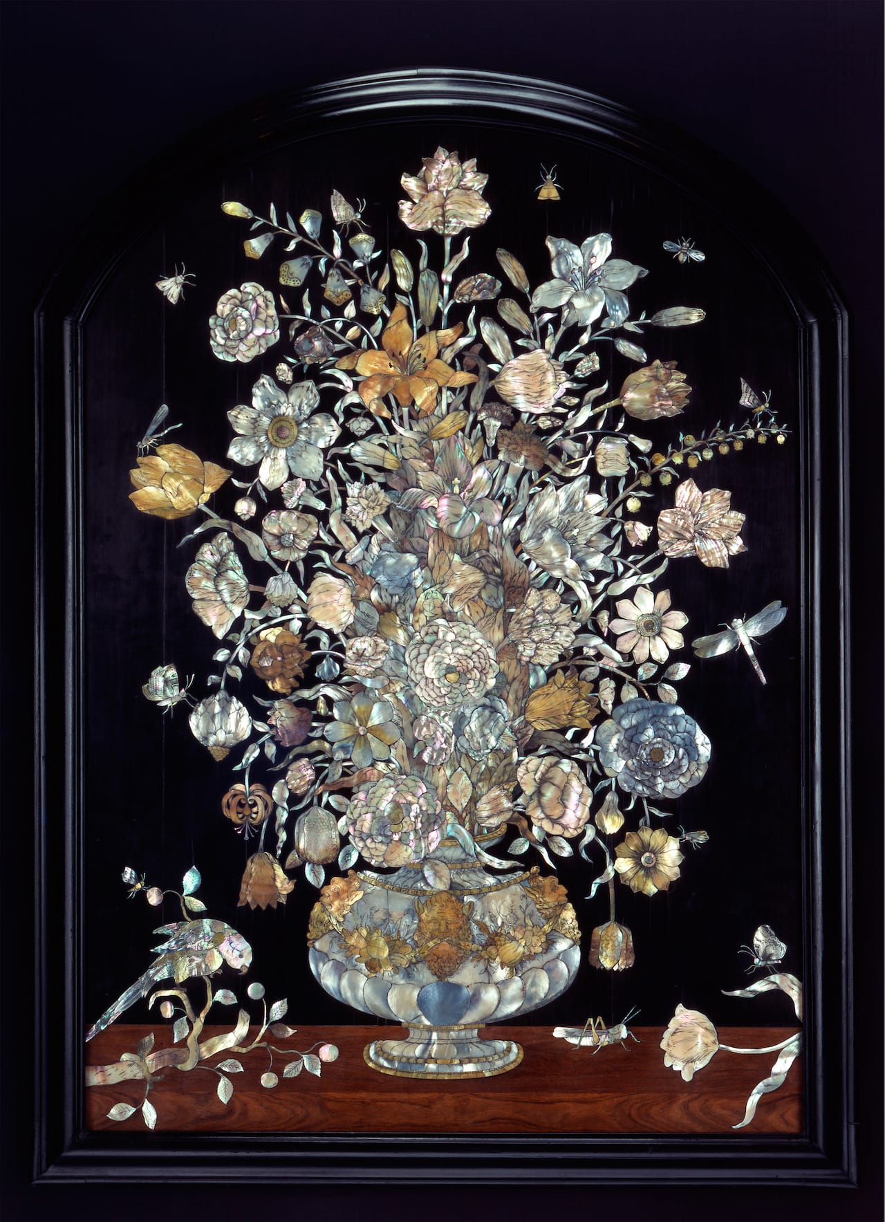 Sometimes the items were made to order for the Europeans, like a plate in blue-and-white porcelain with the VOC logo — its O and C ominously impaled on the arms of the V — painted inside a central disc like an eye upon the diner. In other instances, the objects were simply acquired for their intrinsic beauty, such as lacquer chests from the “Fine Group” — a limited series of objects that Japan allowed the VOC to purvey only from 1635 to 1645. While they were made for the export market, the chests are of the highest quality, featuring landscapes adorned with crystals and mother of pearl, the blacks somehow simultaneously deeply matte and lustrous, sprinkled with gold and silver flakes that create rich dimensionality within the surface of the material.