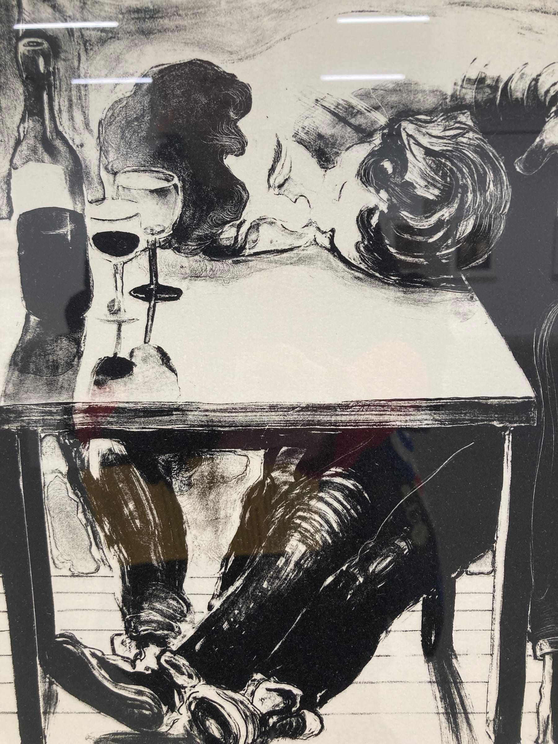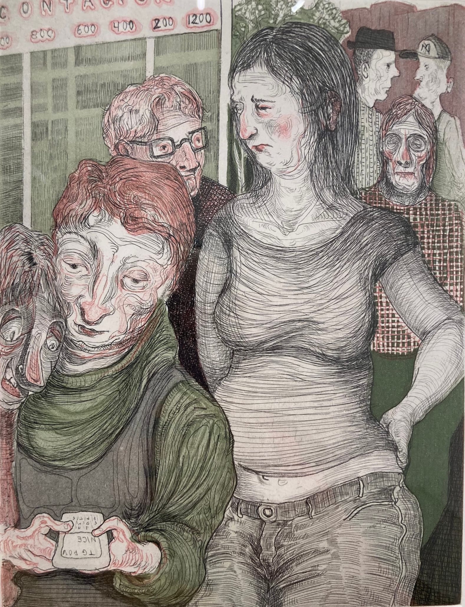 Playful as her content can be, mortality and peril make sober cameos. (Fittingly, in printmaking the term “ghosting” refers to an image from a previous print carrying onto the current page.) In “Tea Party” (2012), a skeleton clutches a scythe that doubles as an American flagpole; and in the collograph “Night Smoker,” an abstracted profile eyes us while taking a drag on a cigarette. In “Contagion,” an etching with aquatint from 2012, reprinted with green and red ink in 2022, strangers loom around a smartphone that cryptically reads “TG POV NICE.” The massive "Beer Garden" (2012–17) — a combination of etching, aquatint, and drypoint chine collé — depicts, among the raucous hoi polloi, two figures scanning a newspaper with the headline “Drones Over Occupy Protest” blazoned on its back page. It is at once timely to 2012 and reminiscent of the ACT UP protests of which the artist took part in the early 1990s.
