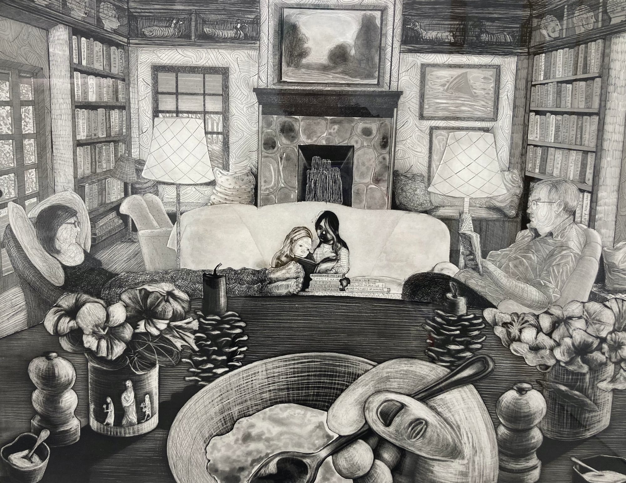 In “Sloppy Bar Room Kiss” (2011), two figures lock lips while seemingly passed out on the corner of a table, their limbs tangled tenderly below. “Watermark” (2012) foregrounds a cartoonish hand scooping up oatmeal in what appears to be a cozy Maine abode, as two young girls read together on a couch in the background. “Thinker” (2012) presents a voluptuous nude woman stretched supine, a thought bubble containing a can of Bumble Bee tuna hovering over her. In a similarly wry vein, “Twelve Heads" (2012) features a sullen bust in its bottom third with phrases scattered across its surface — the word “joy” becomes “toy” when the J is flipped; such is the artist’s universe. Itself punning the medium of the show, Prince reveres printmaking as an expression of personality and vision equal to any other in Eisenman’s oeuvre.