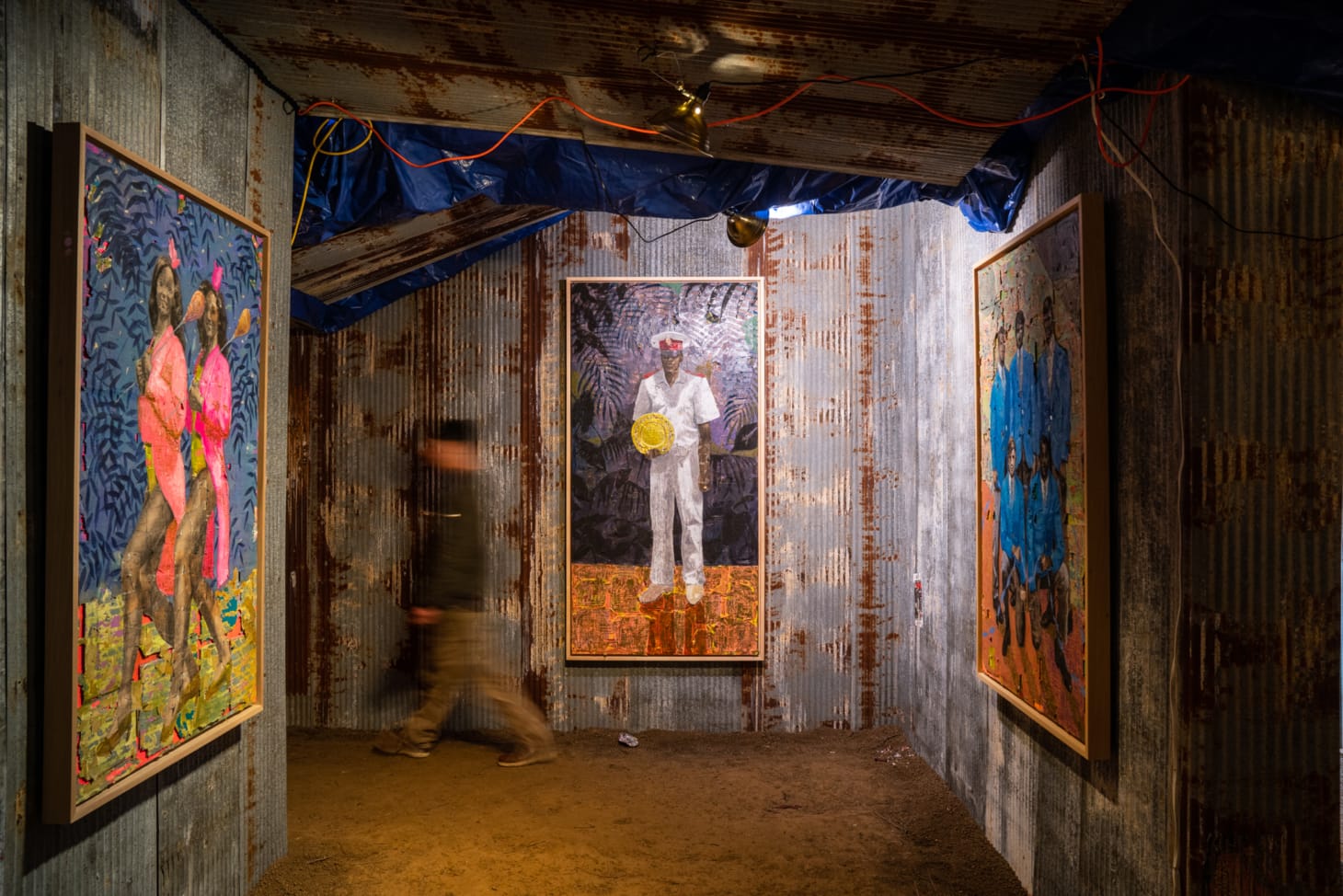 Viewers enter a dark, ramshackle structure composed of corrugated metal walls and a dirt floor, illuminated by work lights dangling from cords and metal clips. The menacing percussion of rain patters overhead. Eight paintings and two sculptures are installed in the structure’s various rooms. While audiences navigate uneven footing, the artist does not tread lightly; Fordjour interrogates the histories of his materials. The corrugated metal, used globally, has become ubiquitous since its development in the 19th century, yet its light weight and ease of transport — once assets — have come to signify colonization, impermanence, and poverty, as in shantytowns and temporary shelters. Fordjour examines the political implications of migration and migrants — including his parents, who emigrated to the United States from Ghana — to underscore how his figures represent injustices and unstable situations.