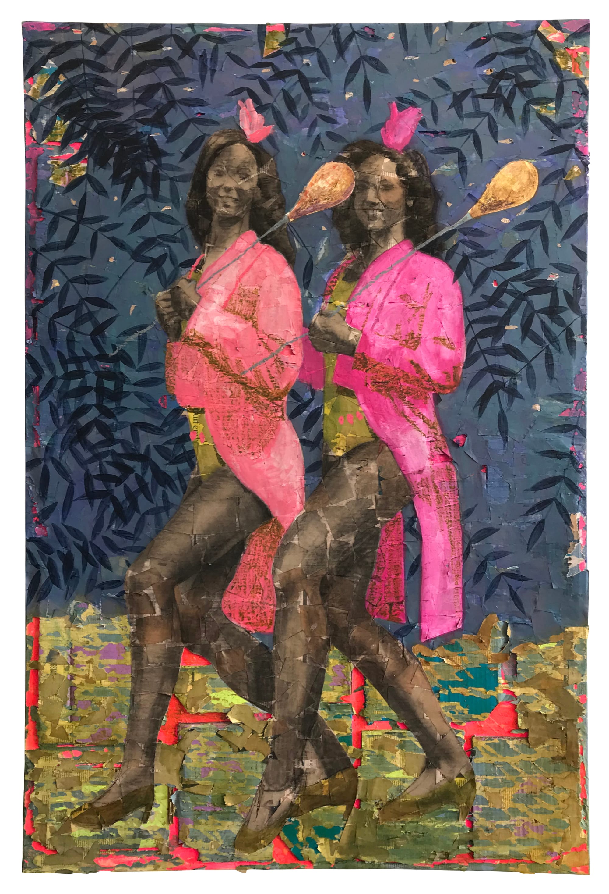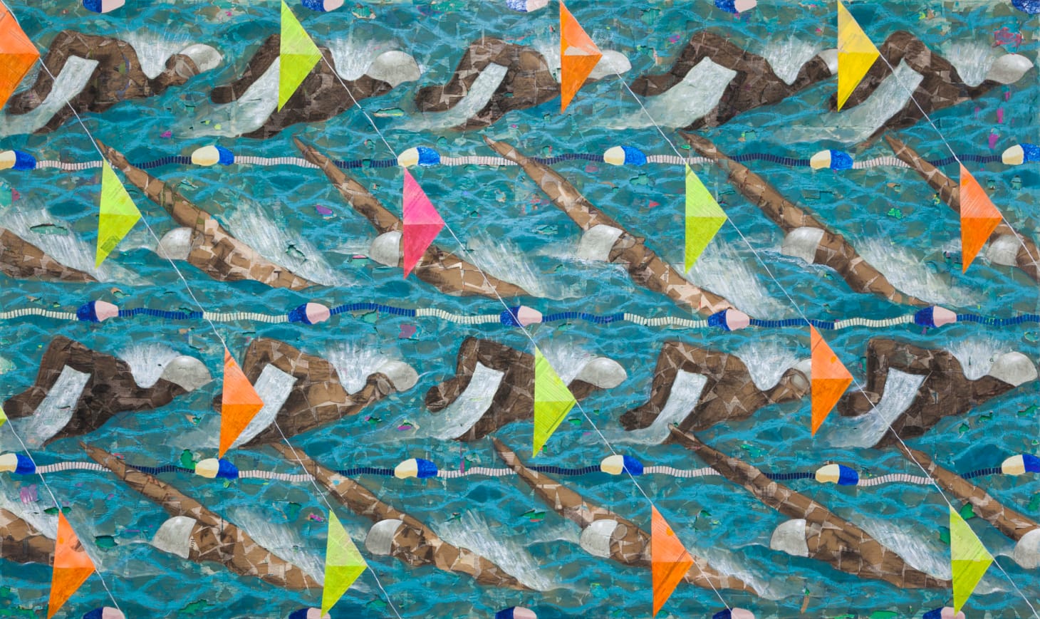 Fordjour excels at multi-figure paintings, and pageantry and sports recur as subjects. His textured canvases have raw substrates of layered cardboard and cut paper under acrylics, charcoal, and spray paint. In “Aquatic Composition” (2019), swimmers advance horizontally through a pool, as diagonal flags cut across them, disrupting their progress. The parameters of the pool are not visible: despite the vigor of their strokes, victory is not in sight for these athletes. Fordjour’s focus on the sports-industrial complex has sociopolitical resonance, as Black and brown people are often only celebrated, and under-compensated, for their athletic contributions.