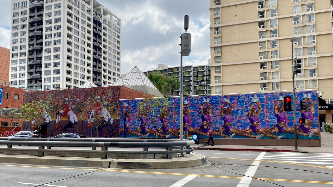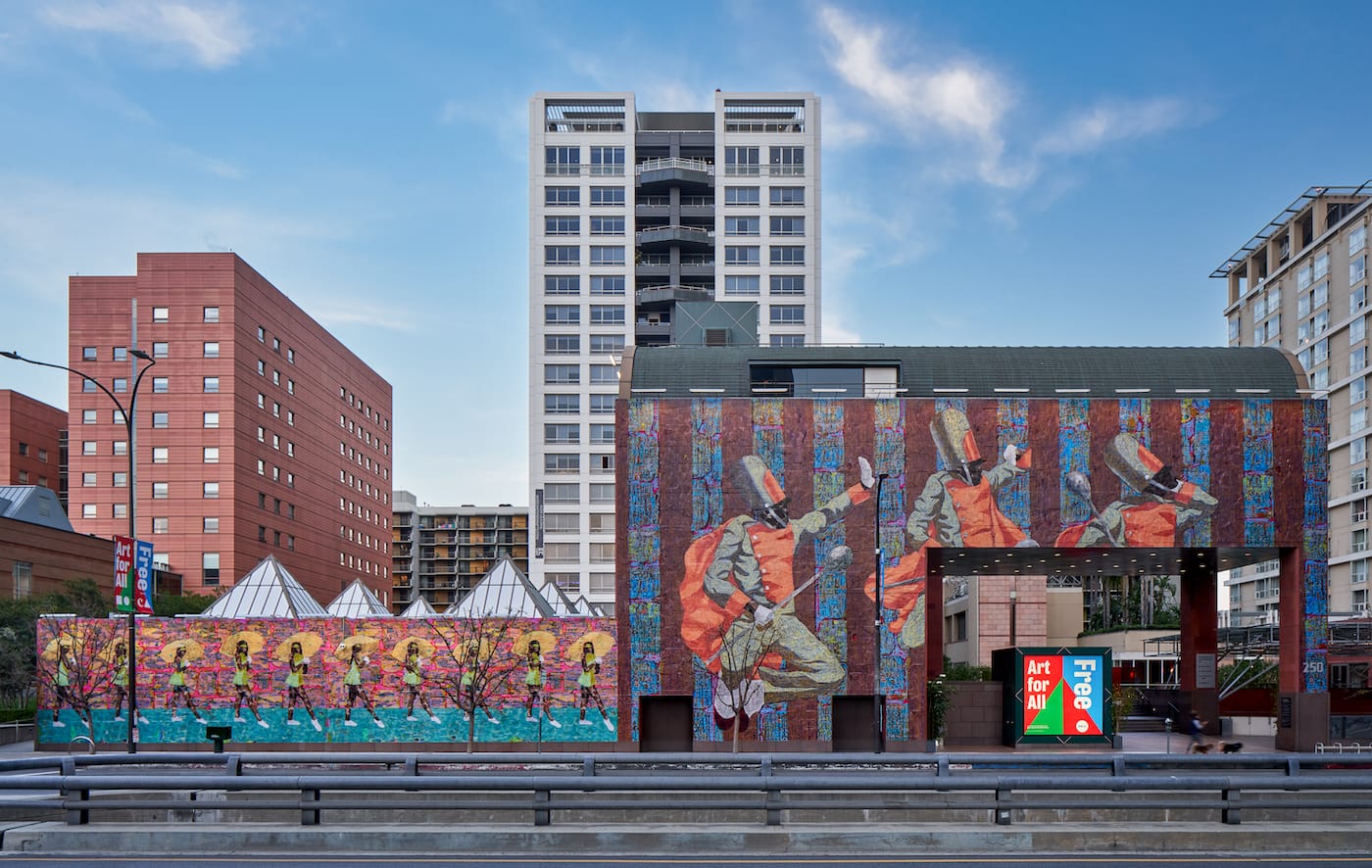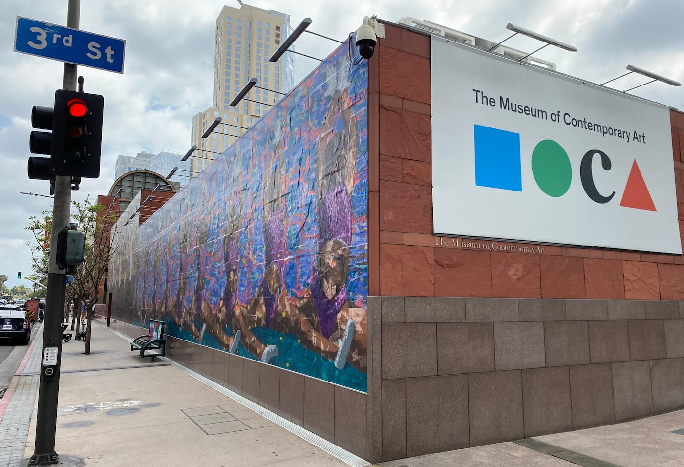 Derek Fordjour's mural for MOCA, “Sonic Boom” (2022), features reproductions of five paintings by the New York-based artist, blown-up and printed on vinyl wrap to cover more than 5,400 square feet of the museum's entrance wall. The work celebrates the marching bands of Historically Black Colleges and Universities (HBCUs), taking its name from one of Jackson State University's famous ensembles, nicknamed the “Sonic Boom of the South.”