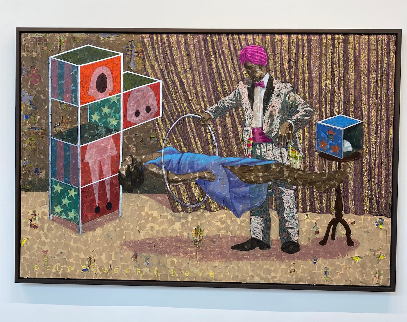 The installation of “Sonic Boom” coincides with Fordjour’s first solo show at LA’s David Kordansky Gallery, titled Magic, Mystery, & Legerdemain. Through his signature collaged paintings, sculpture, and performance, Fordjour channels the theme of magic to examine moments from African-American — and African diasporic — history. The exhibition's highlights include a daily magic show performed by Kenrick Ice McDonald that reimagines the role of Black Herman, one of the first prominent African-American magicians.