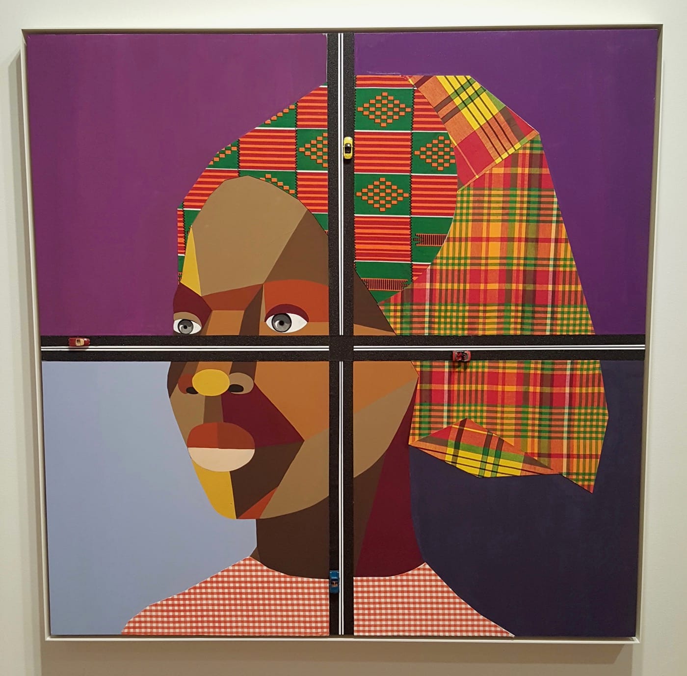 From Transmission to recent work like “Figures in the Urban Landscapes” (2017), Adams presents a gaze interrupted; restricted by the size of a screen, the sightlines of a window pane, or confined by roadways. The figure in the frame and viewer can never inhabit the other’s space. The artworks’ limits accentuate how meaning produced by incomplete representation does not have definitive boundaries. Despite Adams’s use of dashiki and kente cloth, materials embedded with complex concepts of trade and place, or his many shades of mahogany in “Figures in an Urban Landscape,” the contained portal recalls a singular vision. By re-materializing fragments of popular culture as a critique of their proposed universality, Adams recasts their subjectivity.