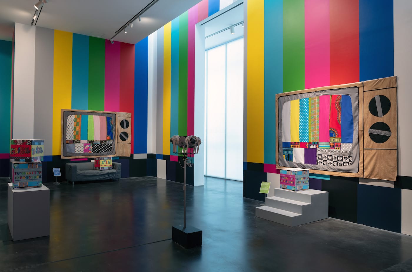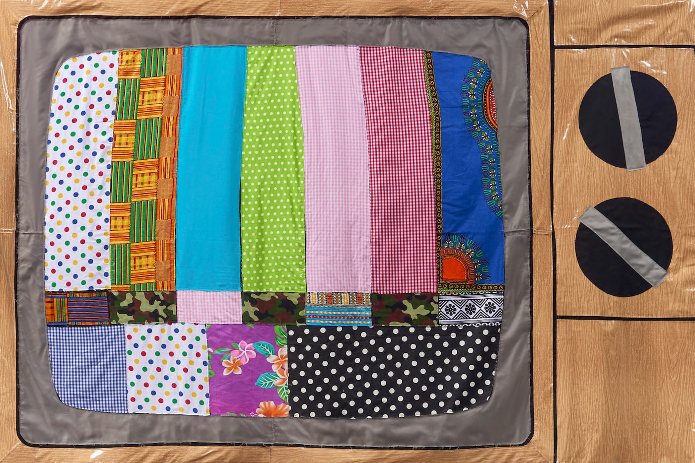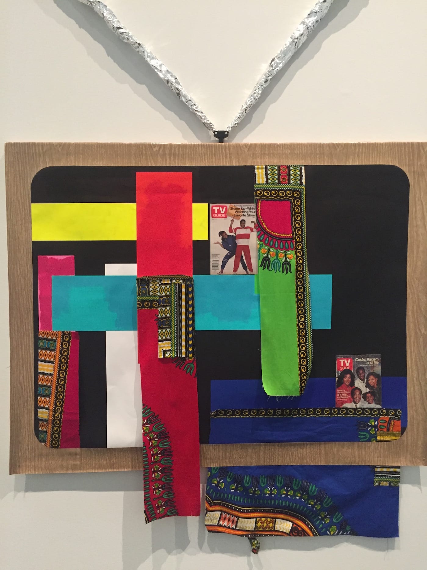 Facing the Boxhead avatars are flat television screens of fabric and paper known as the Colorbar Constellation series (2016). TV Guide covers featuring Oprah Winfrey, Will Smith as the Fresh Prince of Bel Air, and the Cosby Show‘s Theo and Vanessa Huxtable (Malcolm Jamal Warner and Tempestt Bledsoe) float within the televisions borders among panels of solid color and dashiki cloth. In 2016, Adams told Interview Magazine: