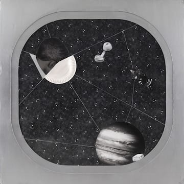 When the exhibition extends to the Future People series (2017), Adams’s repeated practice of framing persists, converting a TV set into a window into space. Future People’s collages include images of Igbo objects, home goods invented by Charles Harrison and the faces of people that are part human, part satellite, all moving through space in a fusion of Afrofuturism, consumption, and a fragmented record of black culture. Although the vantage point of space may seem infinite, vision is limited through the portal.
