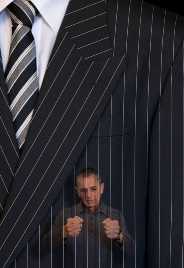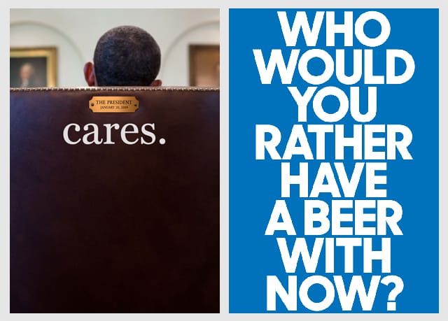 Bonnie Siegler‘s entry, the first in the series, is one of my favorites. We see the back of Obama’s Oval Office chair with his title emblazoned on a small nameplate. Siegler adds some text, turning the leather chair back into a collaged statement: “The President cares.” Paul Sahre‘s minimalist, all-caps entry boldly asks a provocative question directed against the previous administration.