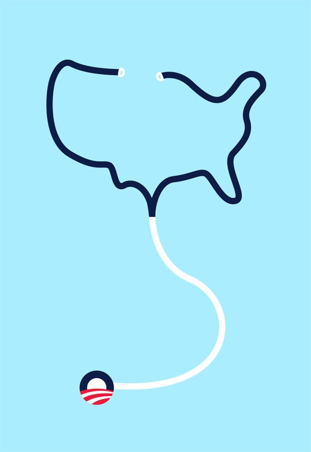 The posters range from literal explanations of Obama’s worth and Mitt Romney’s misdeeds (see Woody Pirtle‘s blistering argument against Mitt’s outsourcing practices in a no-nonsense sans-serif typeface) to elegant infographics. On the purely visual front, Christopher Brand pays eloquent testament to Obama’s health care improvements with his image of the United States’ borders turned into a stethoscope (seen at top).