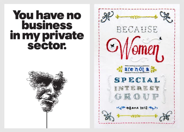 Both Hilary Greenbaum and Elizabeth Amorose tackle the women’s rights side of the election controversy. Amorose’s poster poetically appropriates embroidery as a symbol of the feminine while Greenbaum’s Romney portrait-turned-pubic hair is super freaky.