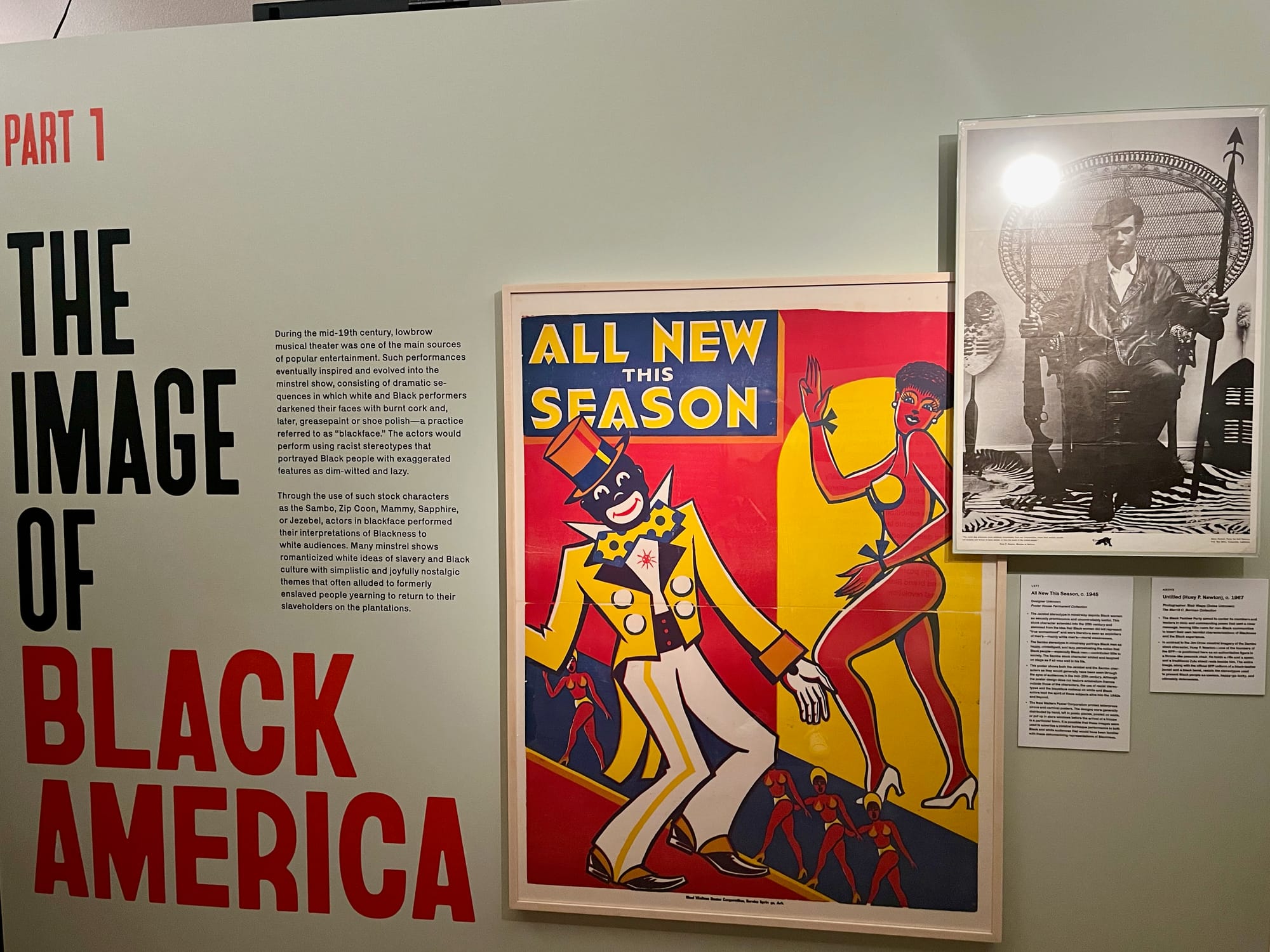 Curator Es-pranza Humphrey contextualizes that the Panther’s powerful pro-Black imagery emerged during a period when racist stereotypes portrayed in 19th and 20th-century minstrel shows influenced perceptions of Black identity. “All New This Season” (c. 1945) and a poster to the right featuring Newton from 1967 are foils for each other, portraying the roles of Black men in their communities. Unlike the Sambo-like character on the left, Newton sits with a straightened posture and solemn expression showing the seriousness of the BPP’s agenda.