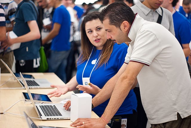 The Apple Store pays attention to every detail. You might think that Apple positions all its notebook computers for aesthetic reasons. That’s partly true. The tables are uncluttered and the products are clean. But the main reason notebook computers screens are slightly angled is to encourage customers to adjust the screen to their ideal viewing angle — in other words, to touch the computer!