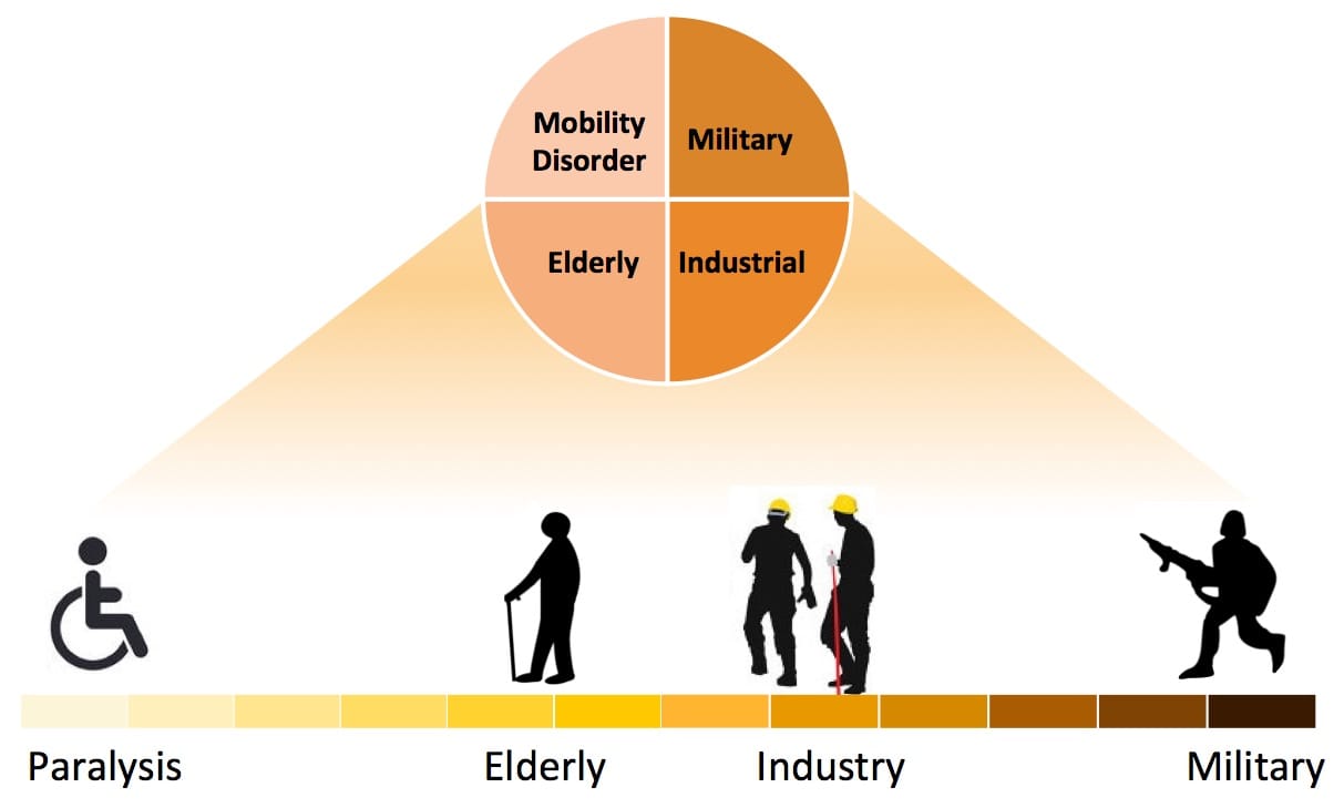 Diagram found on suitx website. A circle divided into four equal sections, individually labeled with text reading mobility disorder, military, industrial, elderly. Below the circle is a line gradated from light yellow on the left to dark brown on the right. Above the line are black silhouetted images of people spaced evenly apart. From left to right the silhouettes are, a person sitting in a manual wheelchair above the word paralysis, a person using a cane above the word elderly, two people wearing yellow hardhats above the word industry, and a person with a gun and a shield above the word military.