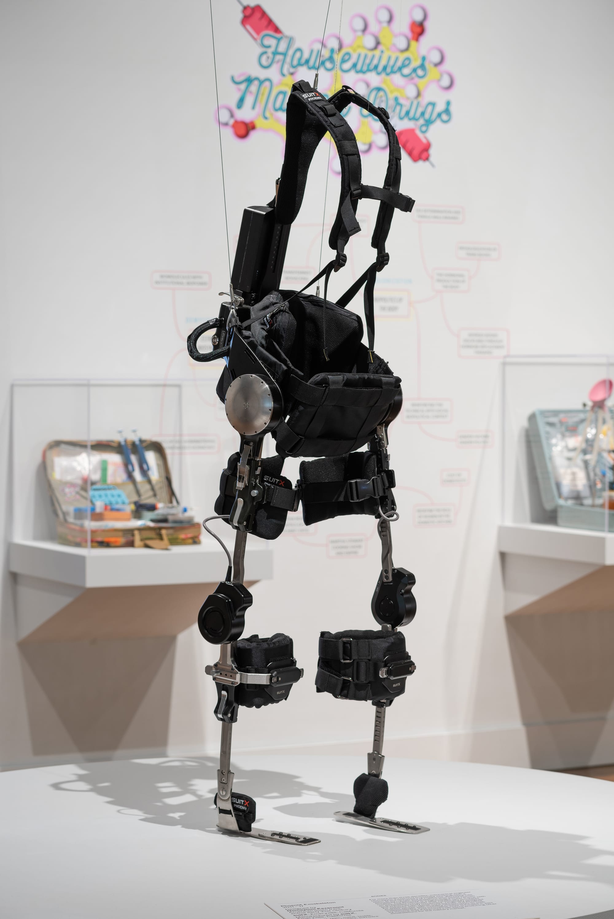 One of the first designs you encounter when rolling into the gallery is suitx’s PhoeniX Exoskeleton. Designed by Homayoon Kazerooni, the PhoeniX is a robotic system consisting of modular leg braces with computerized motors at the hips, powered by a battery worn over the user’s shoulders like a backpack. The museum placard presents it as a mobility device to “help patients,” or disabled people with paralysis of the lower limbs as a result of spinal cord injury, “walk independently.”