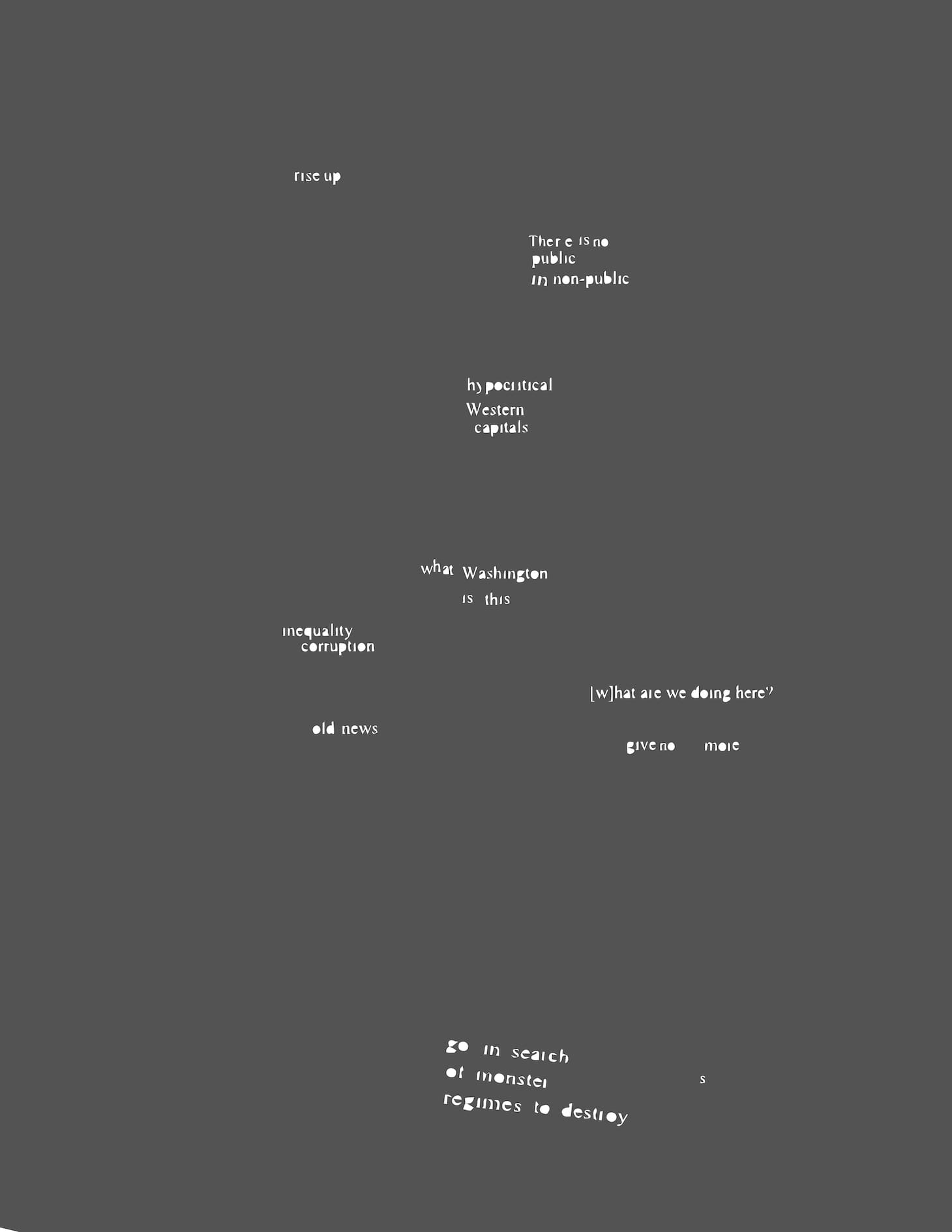 “Destroy Monster Regimes is in many ways a protest — against the current state of affairs in the US, against good old boys clubs; against conservative lovelust for Cold War Reaganism, against social media scams and fictional personas espoused by the Trump cronies; in general, against the petty thuggery of fascist monsters,” explained Fischer and Hawley (who is also a Hyperallergic contributor) by email.