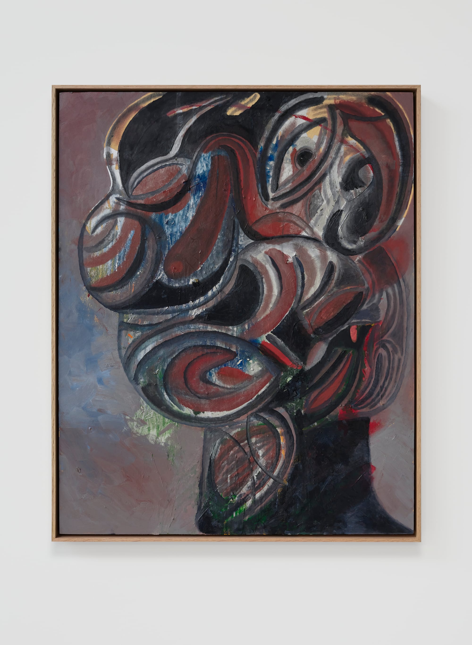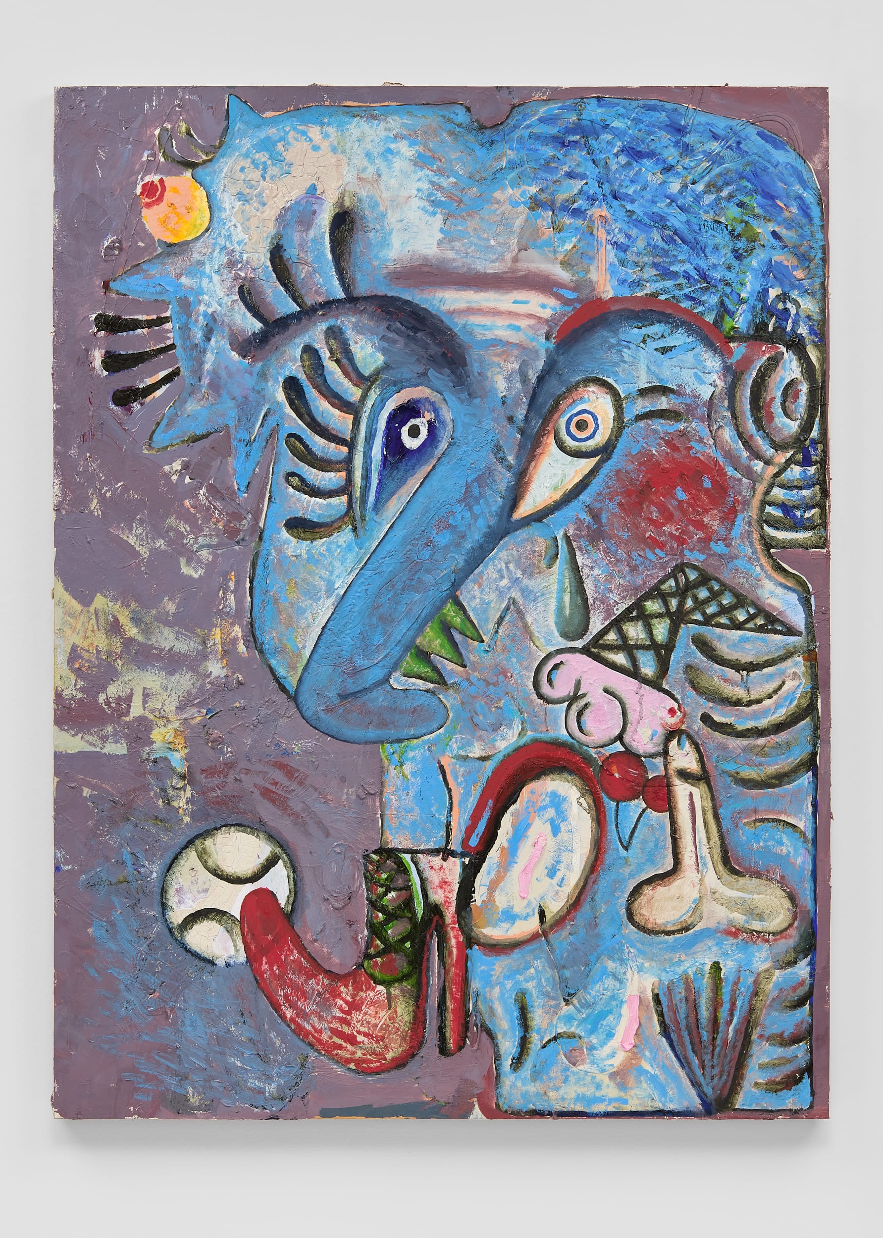 This theme takes the form of the body’s undoing, a literal unraveling of selfhood. The exhibition is rooted in the artist’s study of Chöd Buddhism and the practice of offering up one’s entire body. The painting “The Kiss”(2021) implies a fragmented affinity with the self, a fleshy, double-orificed face folded inwards. Banhart plays with repulsion, figures turning themselves inside out until the body is defamiliarized. “I would paint something repulsive till it started to crack me up,” Banhart wrote. Many figures retain this mix of the grotesque and funny — impish, puckering faces that look on the verge of either vomiting or laughing.