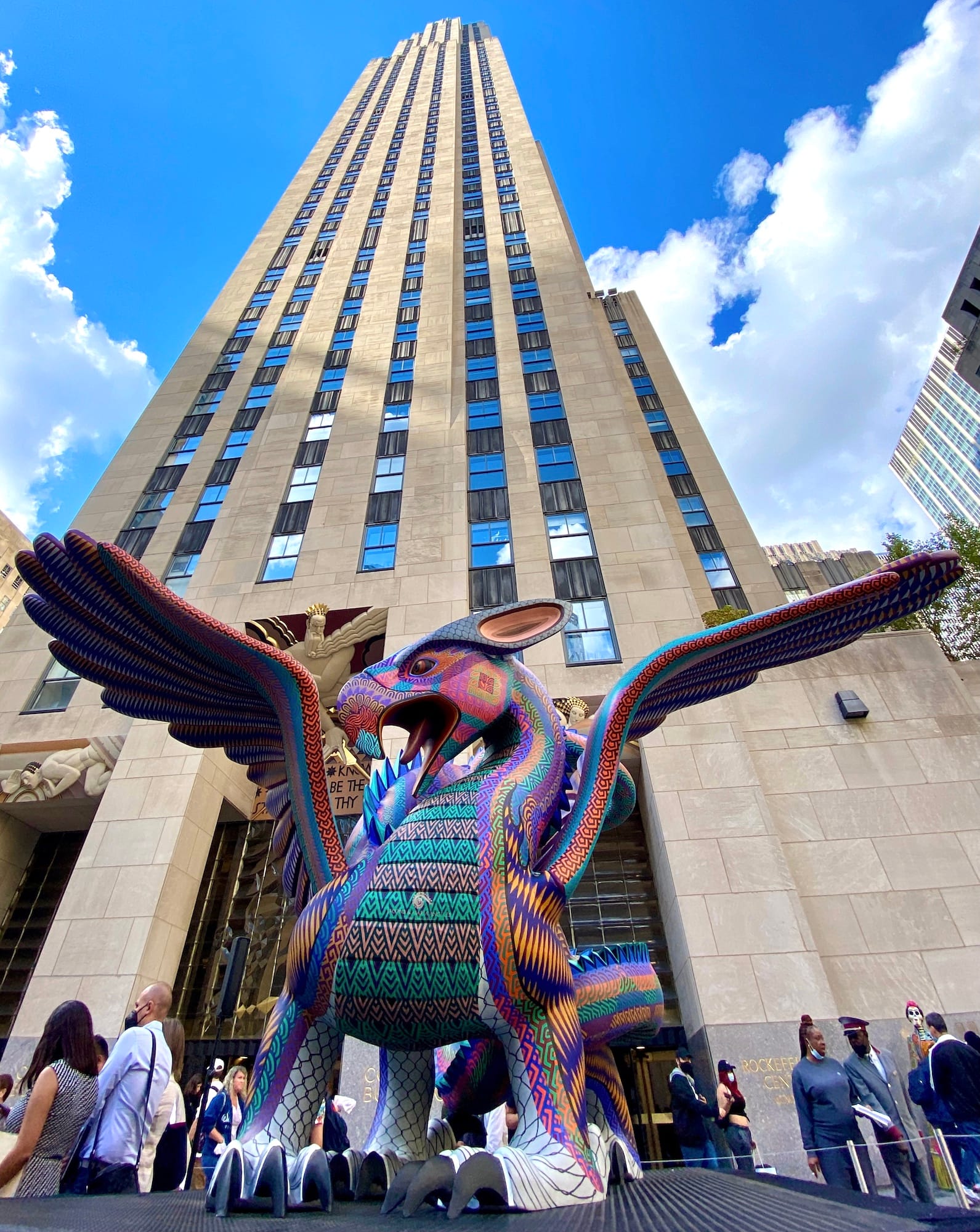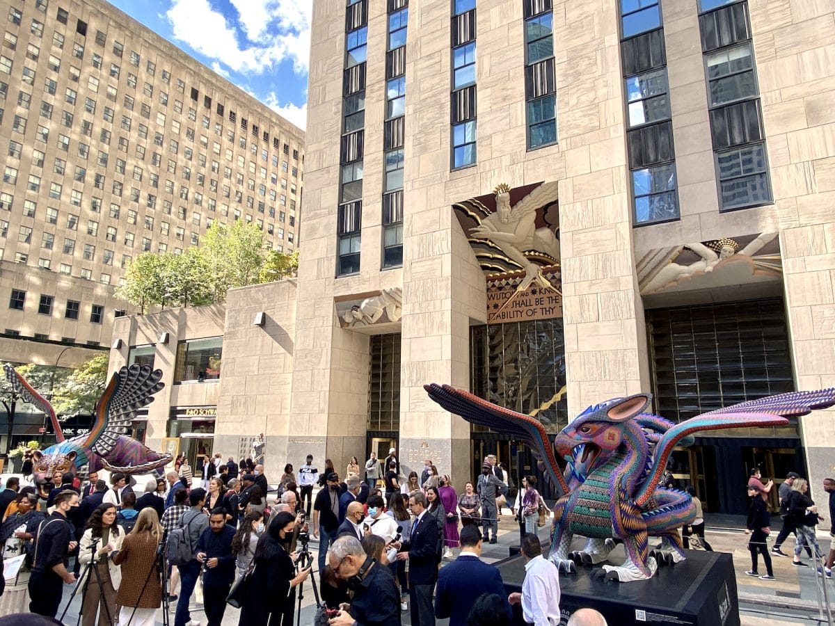 Sculptures of Oaxacan alebrijes, envisioned as guardians of the nation's immigrant community, and catrinas, Day of the Dead skeletons, are now at Rockefeller Center.