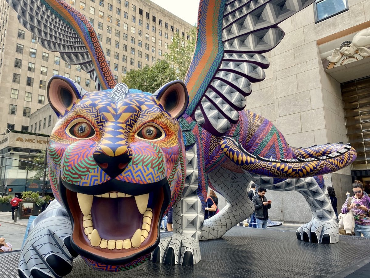 In the Manhattan landmark’s Center Plaza, Angeles Atelier presents two towering alebrijes, vibrantly-colored sculptures of animals and mythical creatures meant to serve as spiritual guides: an 11-foot dragon and a 13.5-foot feathered jaguar, both rendered in fiberglass. The first alebrijes were created in the early 1930s by Pedro Linares, an Indigenous Mexican artist, using papier mâché; in the southern state of Oaxaca, artists have continued the tradition in the medium of carved and painted wood.