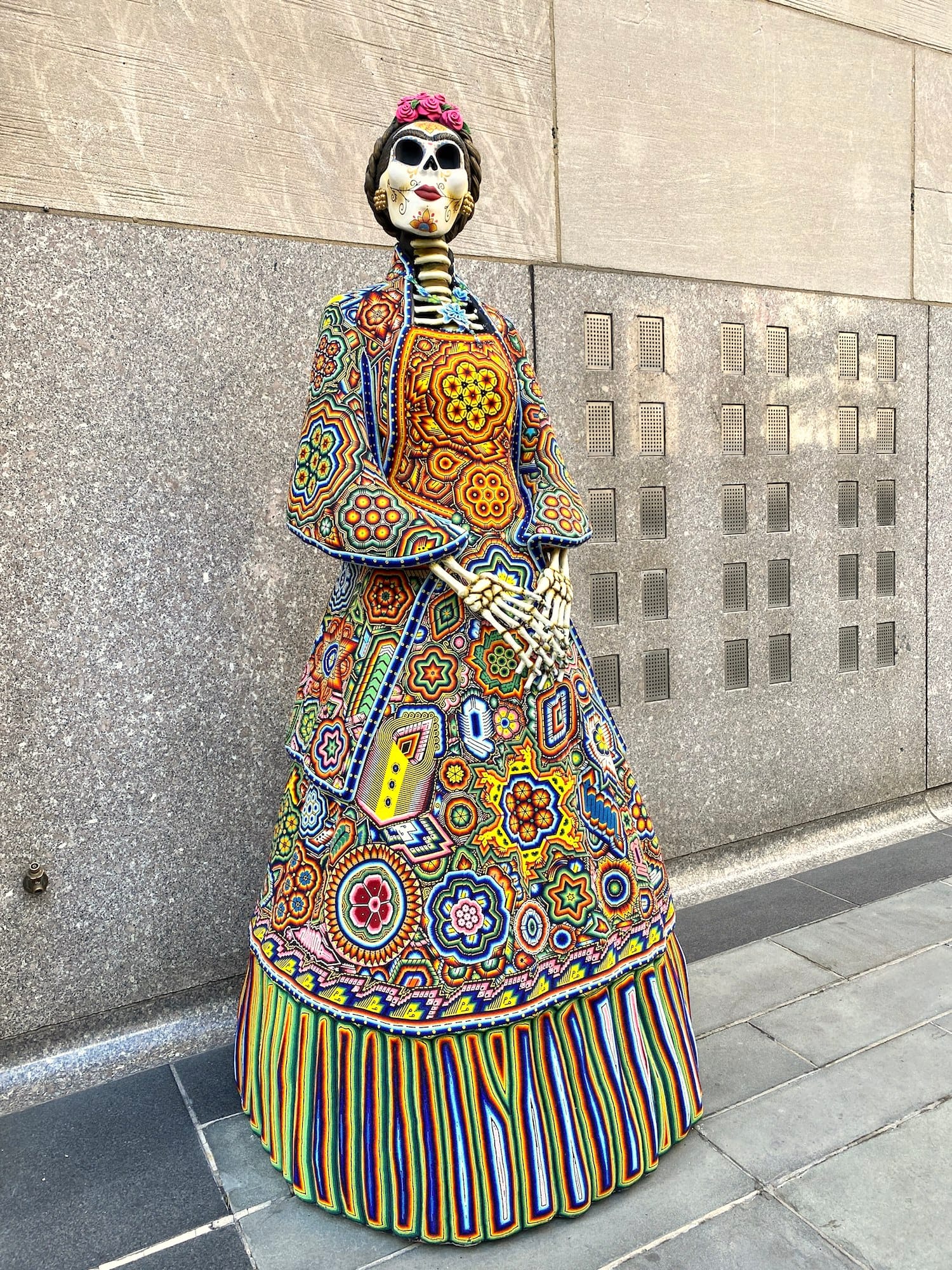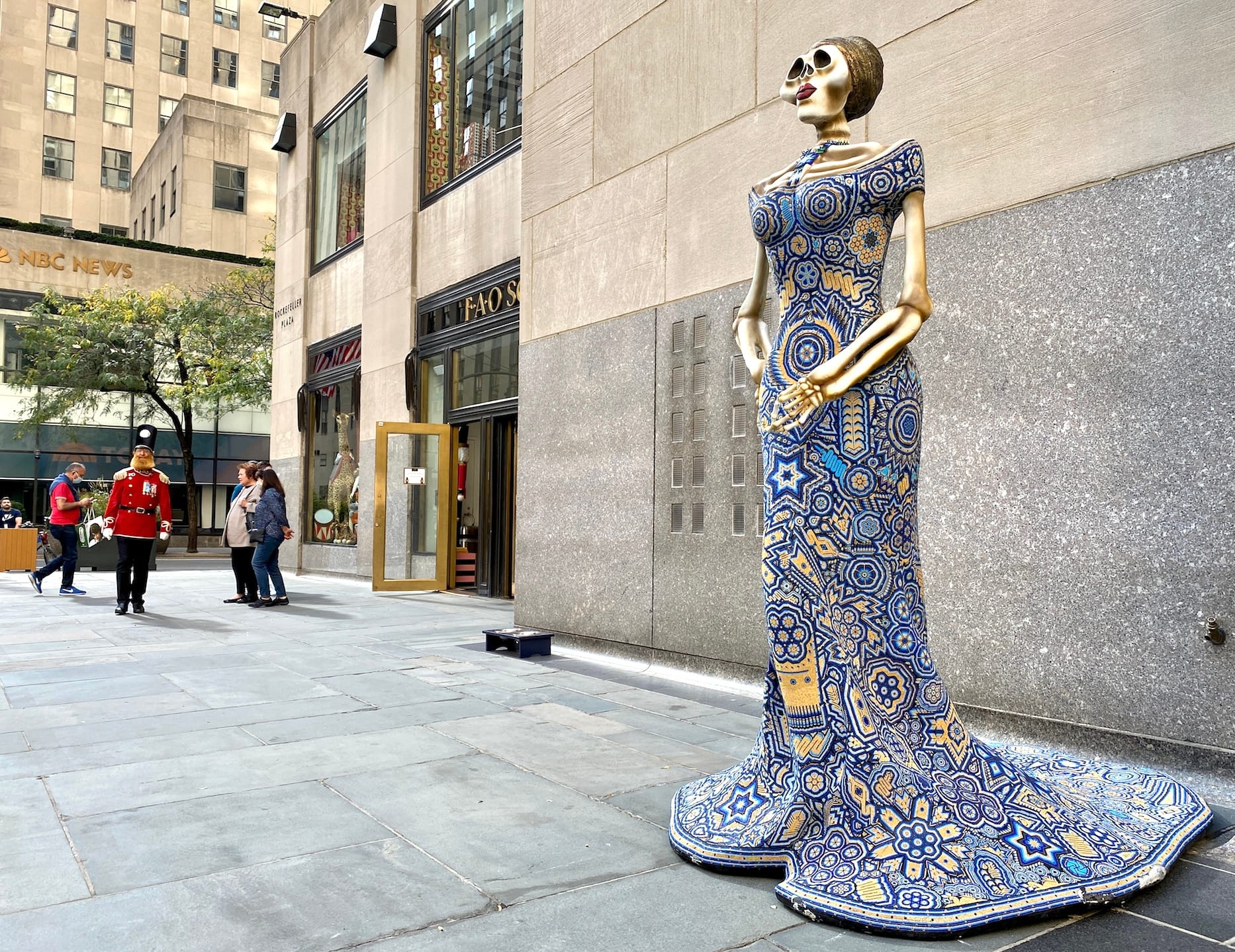 Flanking the entrance to the famous skyscraper at 30 Rockefeller Plaza are two catrinas, skeleton figures representing the Aztec goddess Mictecacihuatl, by Menchaca Studio. The elegant skulls donning floral hats are perhaps the most recognizable symbols of Day of the Dead, inspiring the distinctive make-up, elaborate costumes, and even the pan de muerto (“bread of the dead”) found on many altars during the festivities.