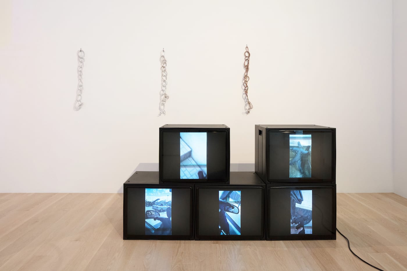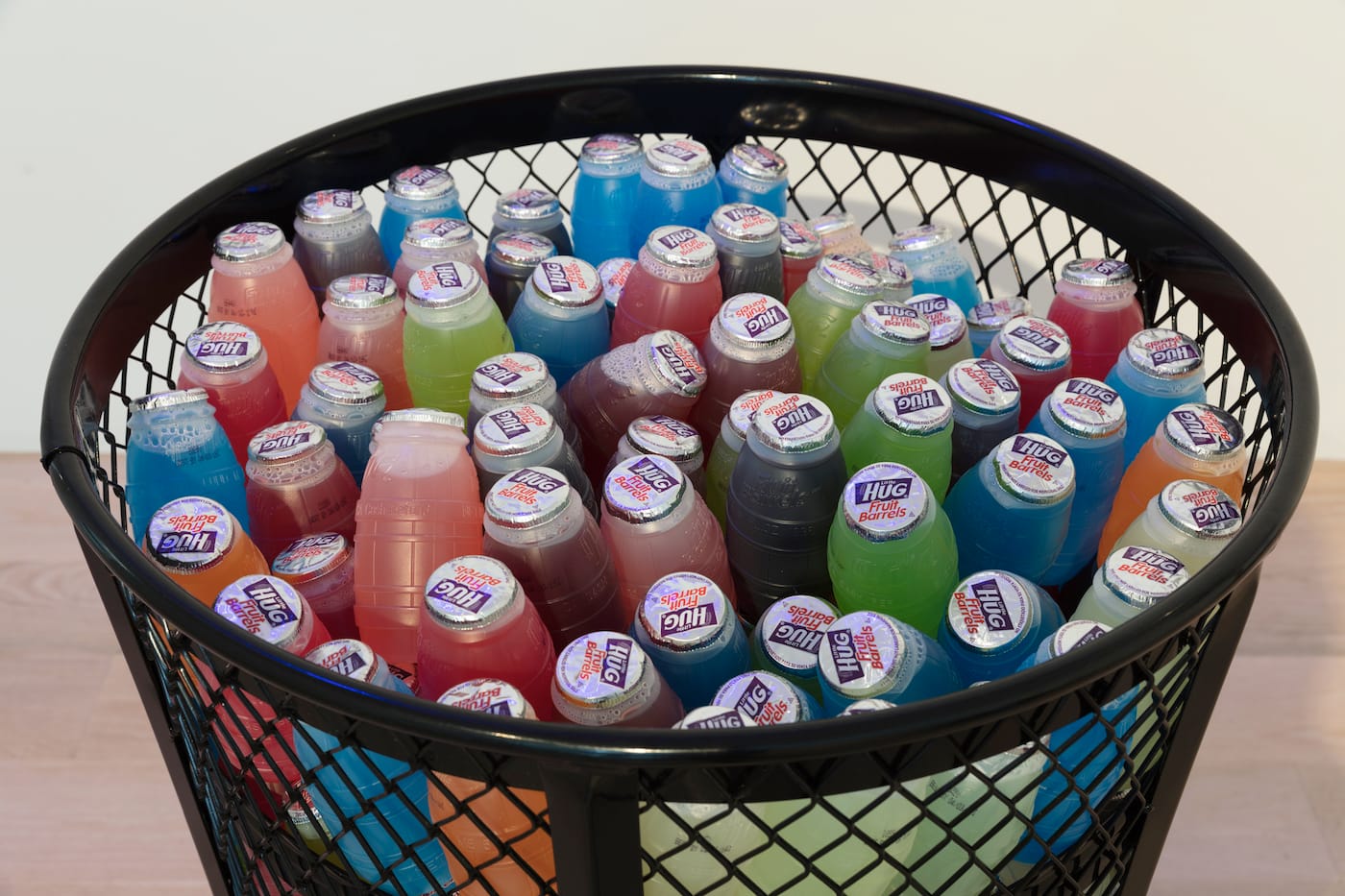 Her exhibition at ICA Miami, Life in My Pocket, is a simulacrum of childhood, and of Stingily’s girlhood specifically: “Fences” (2018), two entryway chain-link fences, imply an opening but also a border; the looped telephone cords of “Double Dutchess” (2018) are perfect materials, Stingily said, for jumping rope. There’s a weathered basketball hoop, titled “Romeoville Driveway” (2018), in reference to the Illinois town, and “Tumble” (2018), a concrete slab layered with coils of Kaneklon hair — a kind of painting in its expression. “Juice Drank” (2018), a trash can filled with Little Hug juice barrels in jellybean colors, is a good reminder of why those drinks are named as such. I’d forgotten the soft and round packaging, the embrace in your hand and sugar-rush in your blood.