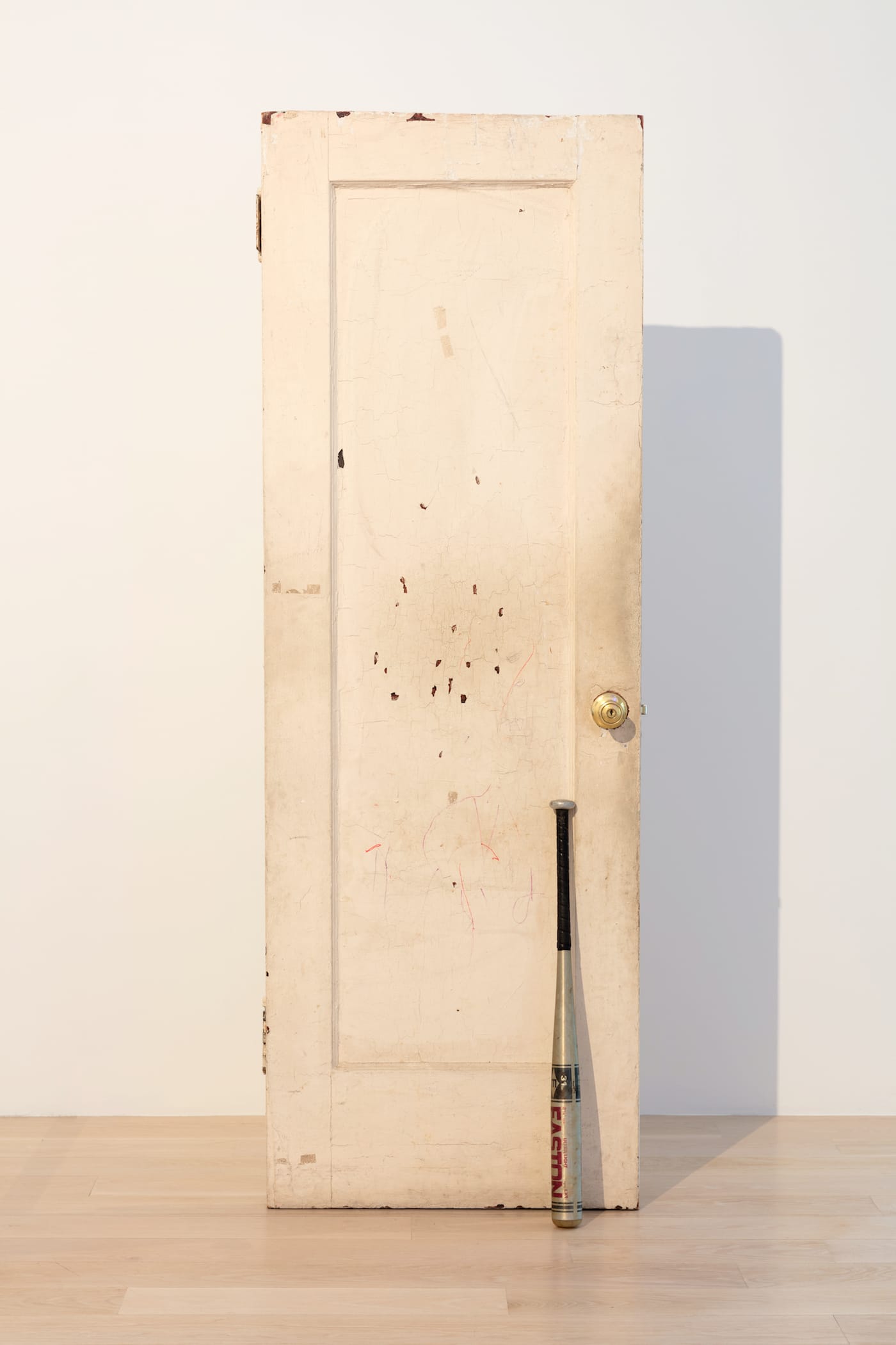There is also the heft of violence, either imposed — as in “Blue Light Surveillance” (2018), a surveillance camera and police light flashing blue across the compact space — or protective, as with “Entryways” (2017), a wooden door flanked with a baseball bat. The latter is a reference to Stingily’s grandmother, Estelle, who had a habit of keeping a bat at the entrance to her home. In an interview with Good Trouble, Stingily said, “I think violence is a part of every day for a lot of people — to be non-violent I think is a very privileged thing.”