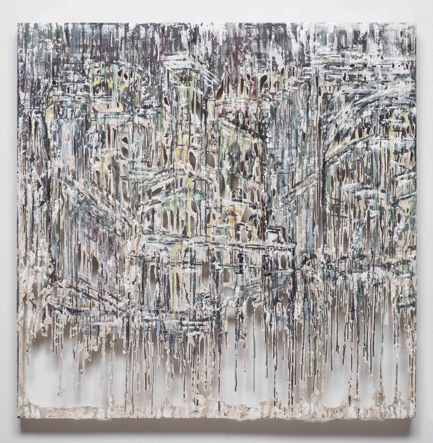 Al-Hadid’s practice in these panels is entirely additive. She uses a “controlled dripping” to layer paint mixed with polymer gypsum, around which gaps and absences branch and pool. No material was removed. These holes form not from puncture, but from careful addition. What is missing is brought along with what is added. Each drip carries with it its contagious absence, wherever it trickles. There are pockets of emptiness, of nowhere or elsewhere, included in these places.