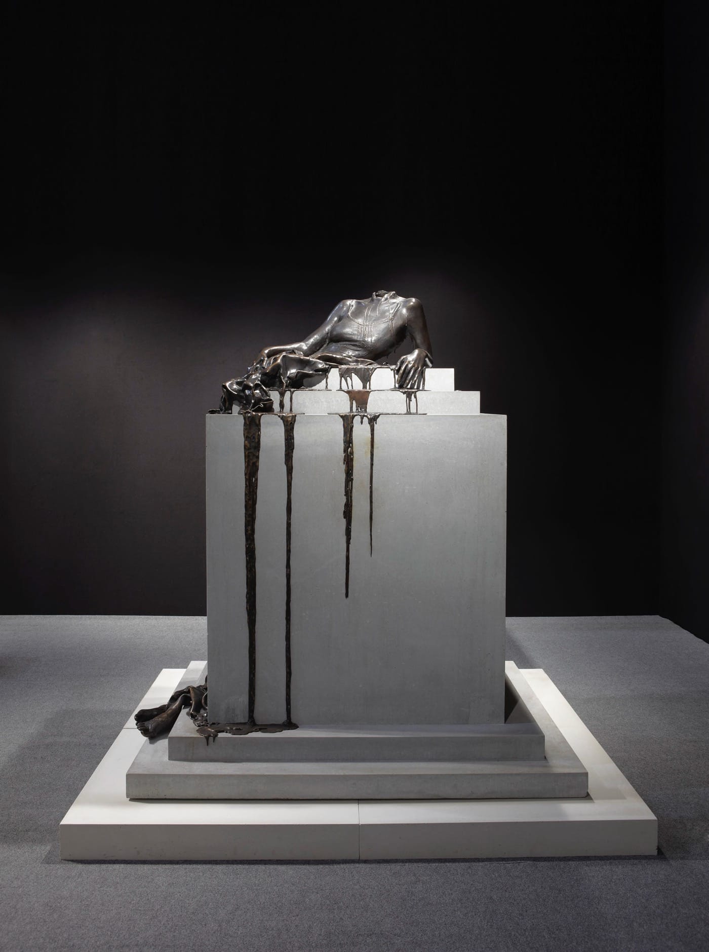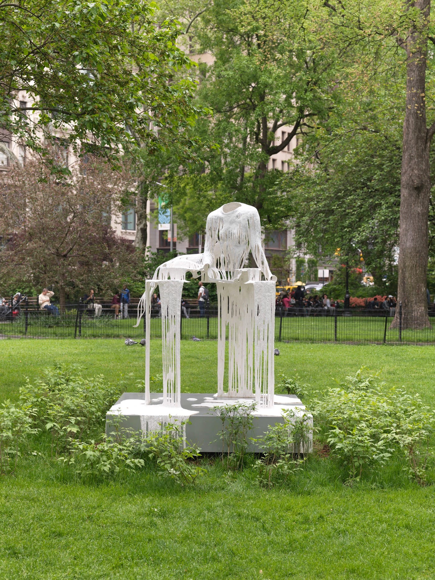 Headlessness recurs throughout the show: In “In Mortal Repose” (2011), a bronze, headless, legless body melts off of a cement plinth. Her bare arms and chest, in modern dress, lean at the top, while a pair of feet have fallen below. This piece anticipates three sculptures currently displayed in Madison Square Park, where Al-Hadid has a commissioned exhibition running concurrently and under the same name as her indoor show at the Bronx Museum. On the park’s lawns, three torsos, headless and legless, all titled “Synonym” (2017–2018), melt off of and into their bases, as if the sun had grown too hot.