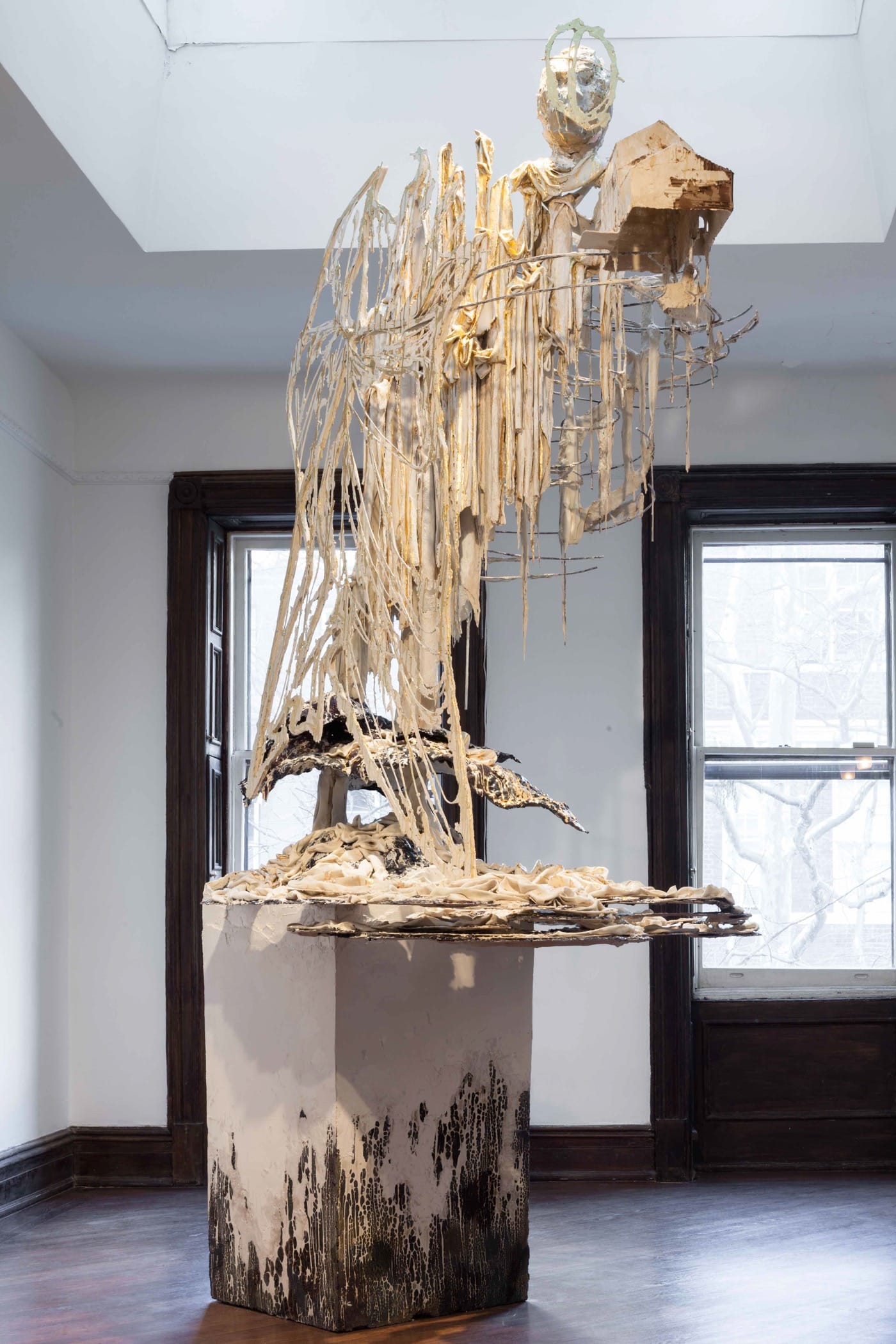 Al-Hadid revisits her old house in the sculpture “Head In The Clouds” (2014). In it, a face adorned with a halo hovers above a coarse, tattered, almost non-anatomical body. It is a body without a situation. Fabric piles beneath the figure, who appears to be covered with a cloak or wings. This saint (or is it an angel?) rises high off its plinth. In an ecclesiastical allusion, this saint holds a model of Al-Hadid’s childhood home in Ohio; in typical religious iconography, saints might hold models of dedicated churches as offerings to Christ. But this is no interventionist American angel, or patron saint of the American Dream welcoming immigrants with the prospect of home ownership. This ragged figure cuts across geopolitical myth. In this era of mass migration and displacement, what might it mean to sculpt, to reference the statuary, to meditate on movement with the stationary? Maybe Al-Hadid means to distrust our ability to ever fully arrive at the place we hope to go. Your house may still, may always, feel like a temporary model. You might feel like a place-holder, until the real you arrives.