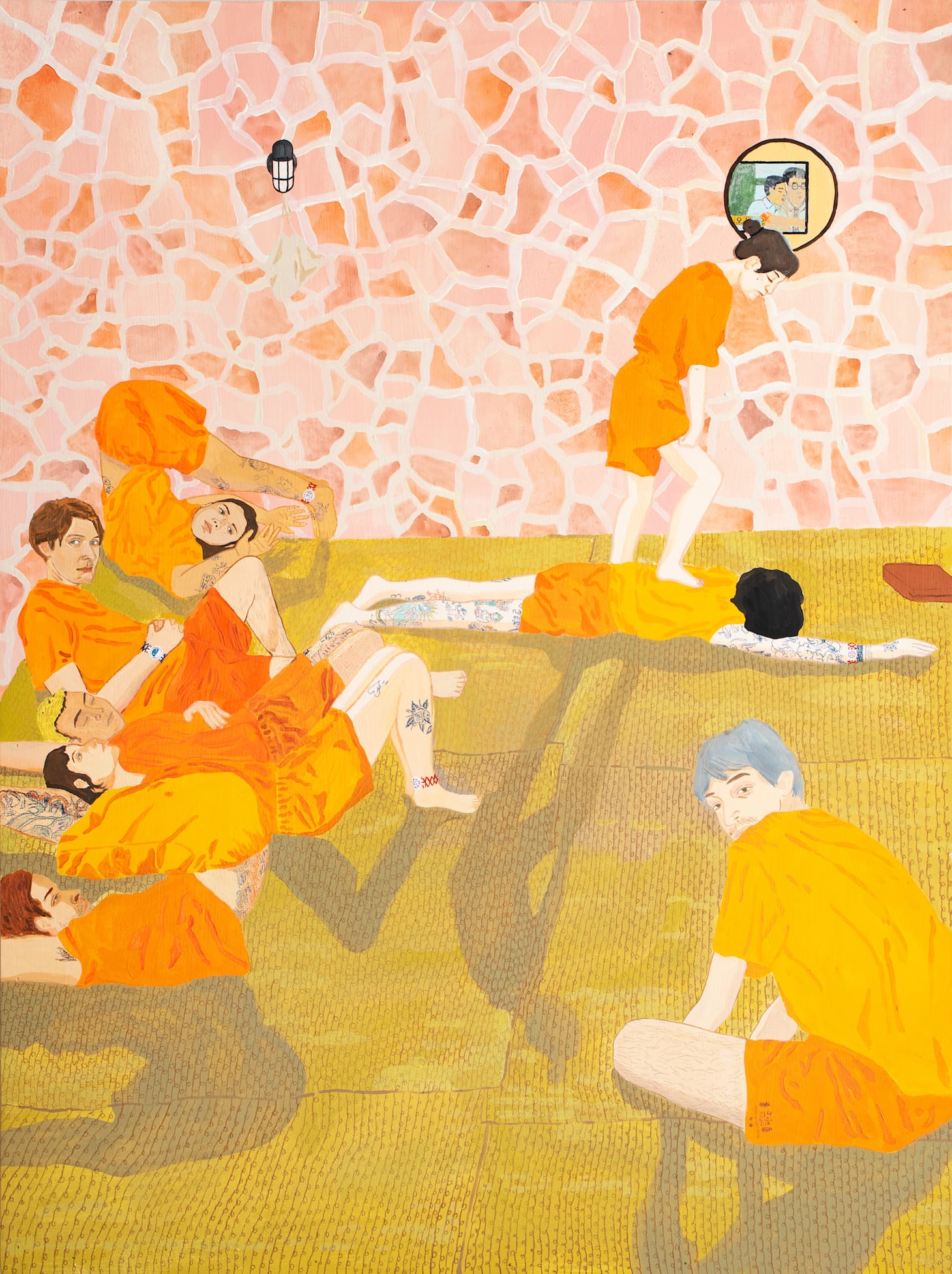 In the vertically oriented “Deep stretching, deep pulling, deep sweating, deep breathing ( A feeling that at moments hinted at rivers running backwards )” (2021), Settles and a smaller cohort gather in the massage room of Jeju Spa, a traditional Korean bathhouse (jjimjilbang) outside of Atlanta, Georgia, where she currently lives. Clad in the spa’s cotton orange pajamas, the eight young adults lounge on citron-colored hemp mats surrounded by pink salt-stone walls; some sleep, others stretch; one stands and presses a foot into another’s back to give a massage. A monitor playing a Korean television show is reflected in a circular mirror on the wall.
