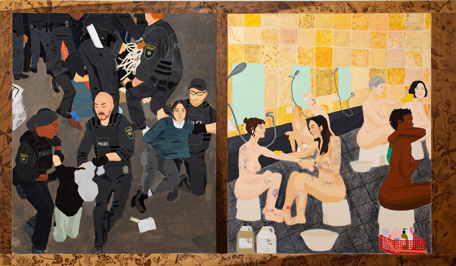 Settles makes the comparison more forcibly with “Nothing is not borrowed & hunger doesn’t compromise together we made this place together we can leave it” (2021), the largest work in the show. The work combines two panels — one portraying her arrest at a protest and the other depicting a small delegation of women at Jeju Spa — in a single wood frame with pyrographed illustrations of flora native to Georgia. In the first panel, police physically overwhelm the protesters and use the force of their bodies to make arrests; in the second, pairs of women scrub each other’s naked bodies (seshin is the notoriously vigorous Korean exfoliating process). Physicality and the body permeate both peace and protest.