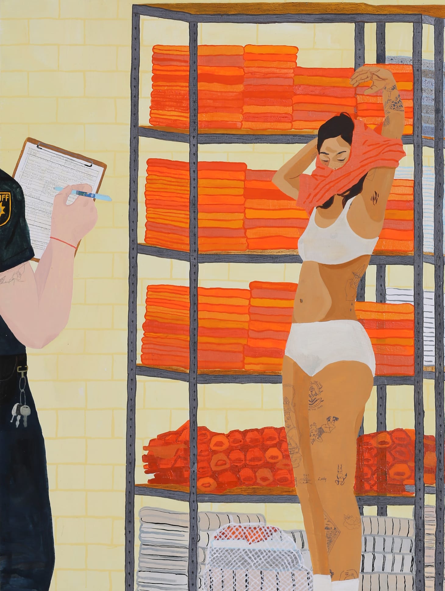 The orange hue of the pajamas is replicated in another vertical work of the same size — “Sometimes it feels like it is over and it’s not. Sometimes it feels like it has just begun and it’s over.” (2021) — only it is a prison uniform, worn by the artist while a police officer fills out an arrest report on a clipboard. Both jail and spa have their own intake rituals, including a specified wardrobe that marks one as part of the institution, if only temporarily. While the two entities are radically different in their functions, Settles suggests that both are sites of human interaction with processes that require us to play defined roles — be it guard, inmate, patron, or employee — that often divide us rather than emphasize our common humanity.