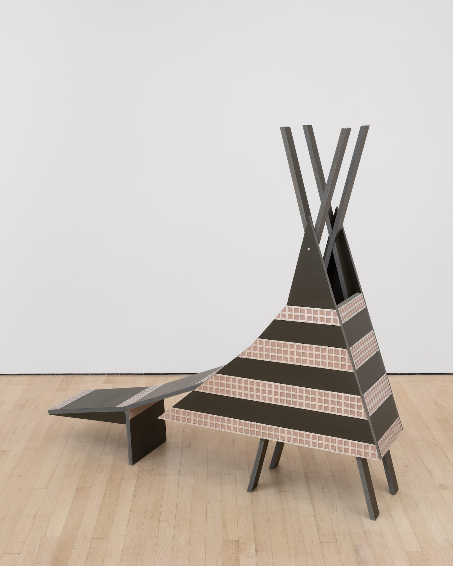 In other works, such as “Gridded Window” (2020), “Roof Shape (Ise)” (2019), “Portico” (2020), and “Three Windows (NYC)” (2020), the architectural reference may be more direct, but something always happens in Simpson’s translation of it into a sculpture. The title of “Roof Shape (Ise)” suggests that the work was inspired by the time Simpson spent in Ise, Japan, which is the site of the Ise Grand Shrine, a complex of Shinto shrines, as well as many other Shinto shrines. In many cases, the public is denied entry and can only see the rooftops of these large temples made of joined wood, in which no nails are used.