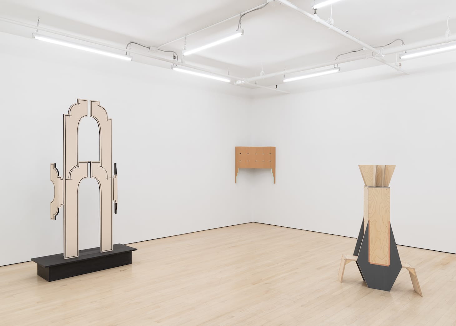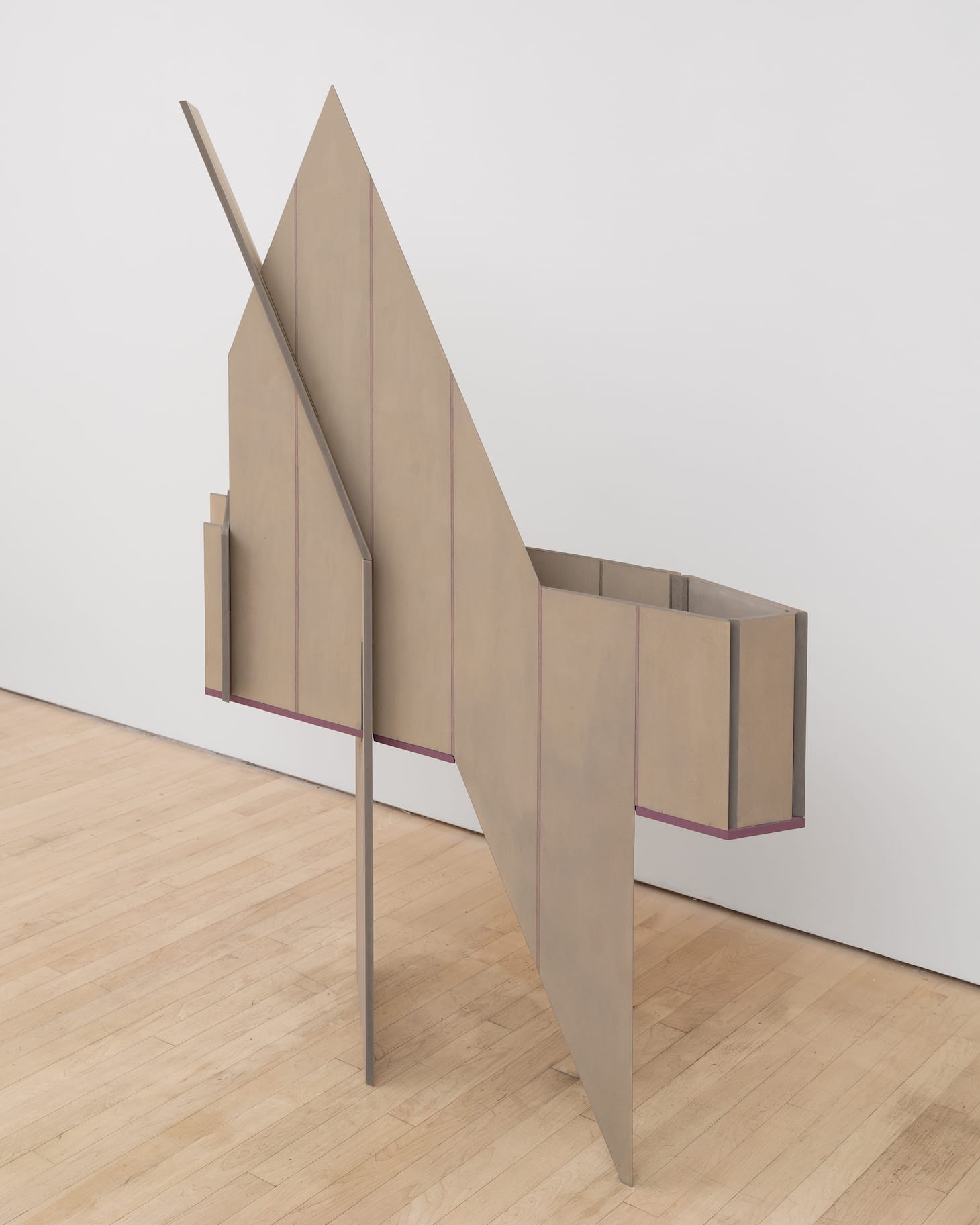 The result is mystifying. I sensed that it was based on something Simpson saw, but I had no idea what, nor did it matter in the end. The fact that it eluded definition was one of the reasons I kept walking around the piece, noticing the angles, the sharp contours, the internal relationships of the forms, all in counterpoint to the fiberboard’s stained tan surface and the spacing of the narrow vertical bands marking off the exterior and interior planes.
