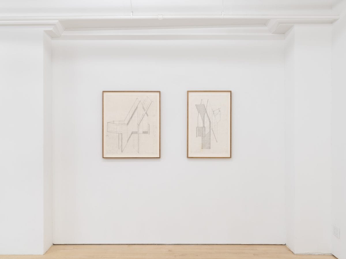 In the two drawings for the sculpture “Two Point Enclosure” (2020), Simpson meticulously plots the angles and size of the fiberboard she used to make this planar work. Mathematical notations are written on one of the drawings, seemingly leaving nothing to chance. In the other drawing, which is of the work’s “back view,” she has described it from another angle. It is as if she had to see the entire object in a drawing before moving to the next step, which requires her to cut the fiberboard in precise geometric shapes.