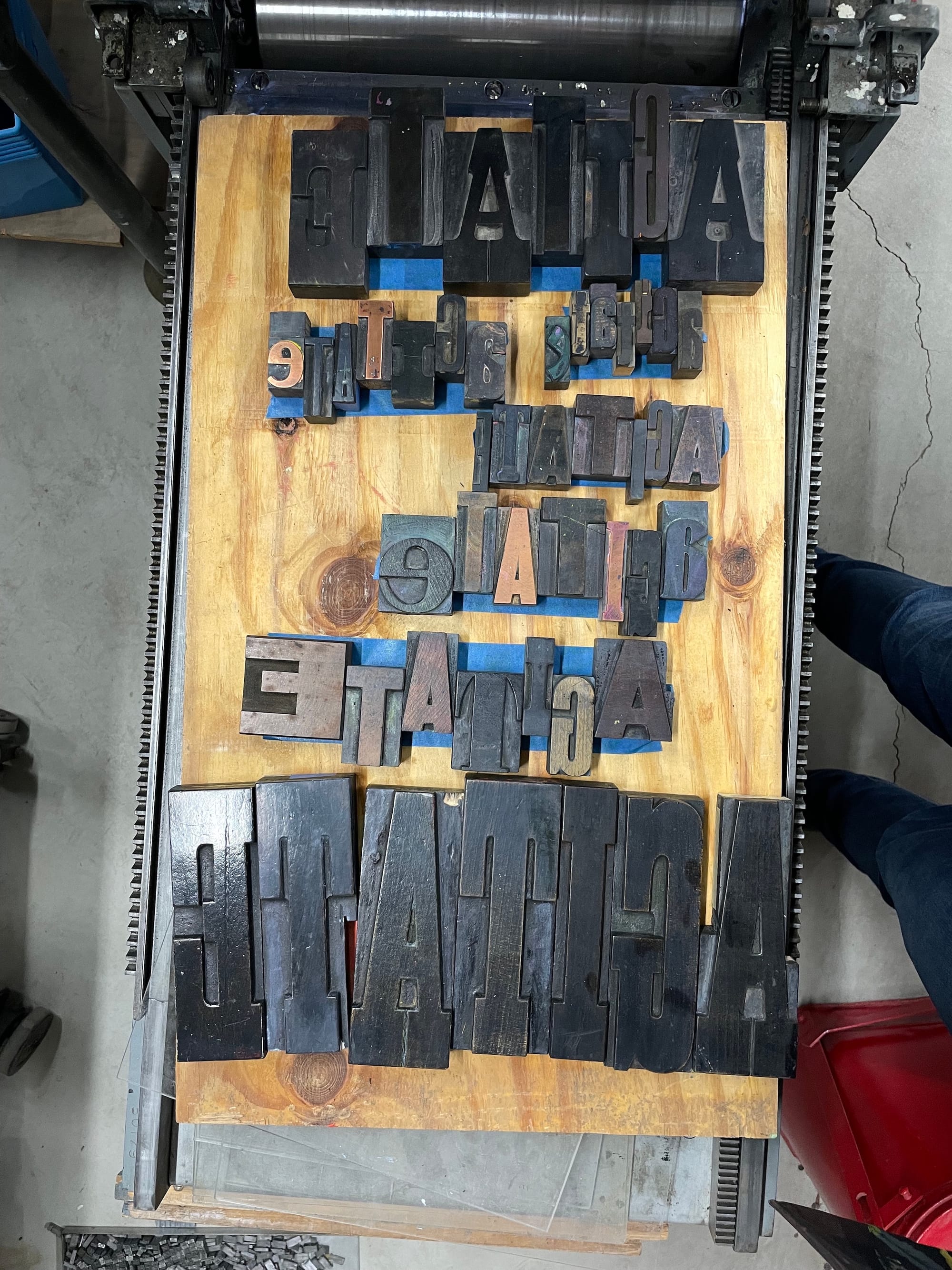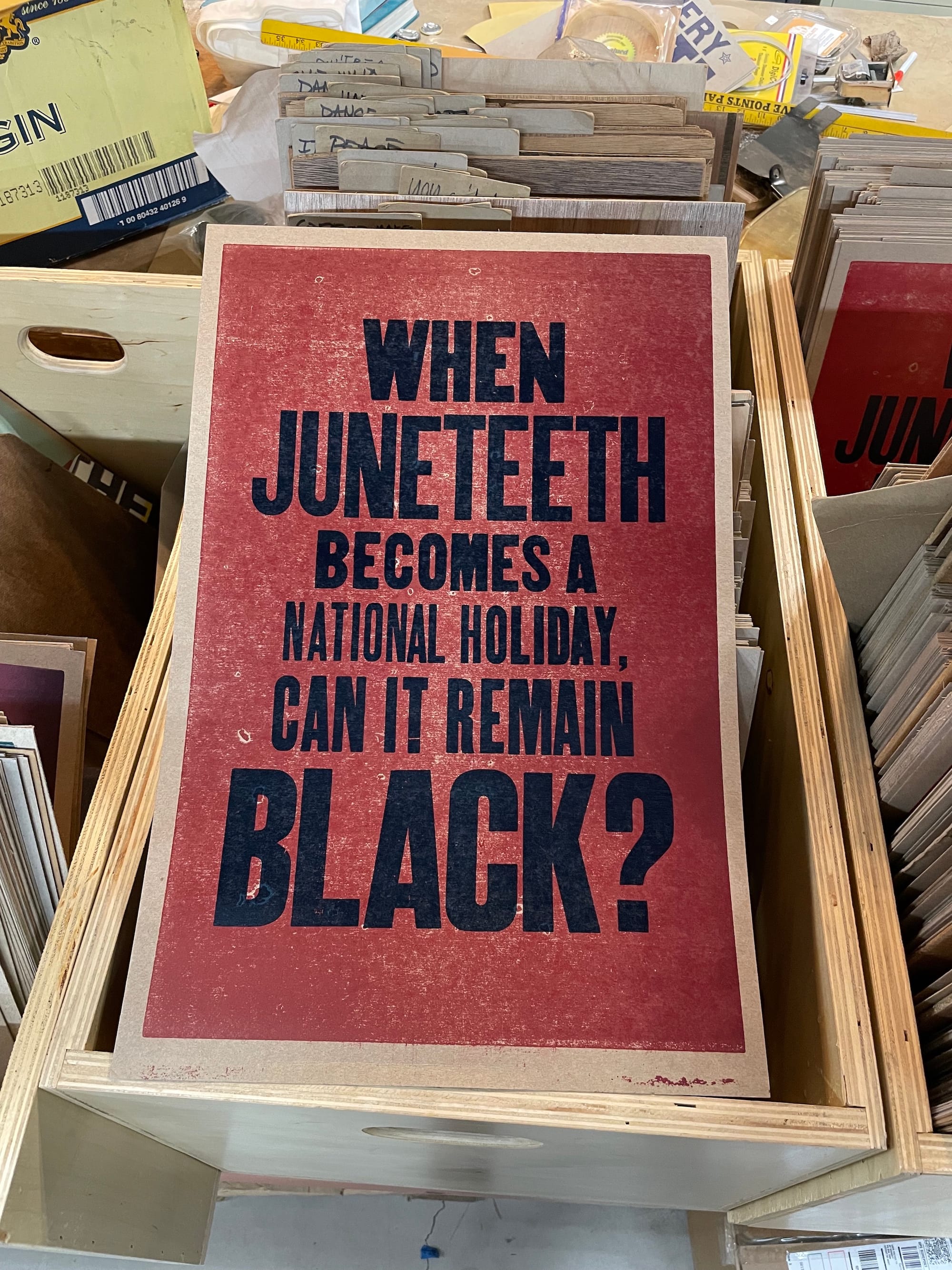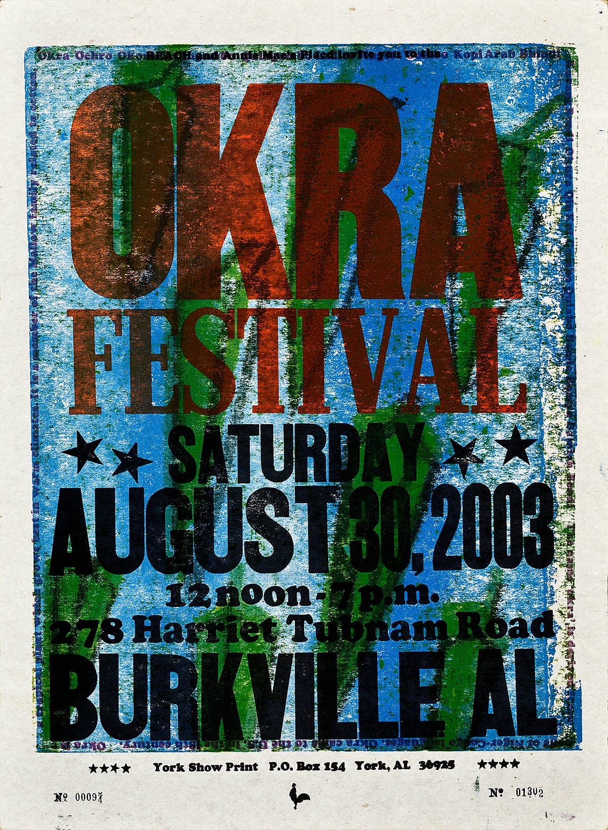 After 20 minutes in his archive, I knew I had been introduced to something unique. Posters in general are not often saved. They are meant to be pasted to walls and stapled to telephone poles, rained on, splashed with mud, and destroyed. So any poster that survives is a small miracle. More importantly, the posters that do survive are typically lithographs that were mass-produced for urban centers, places with a large amount of public wall space and a need for advertising. Amos’s posters are the opposite. They are printed via letterpress, a process perhaps best known today for making cute stationary on Etsy. Each piece in a single print run is slightly different, the colors changing as Amos adds new ink. Decades ago, letterpress printing was part of every town’s local visual language — a means of regional communication where large lithographic printing would have been expensive and unnecessary. Amos taps into that intimacy by reviving the practice, mixing vintage and new wood and metal type into layered, eye-catching designs meant to impart information. Much of his early poster work is also the only documentation of certain events in Alabama, particularly Black community gatherings.