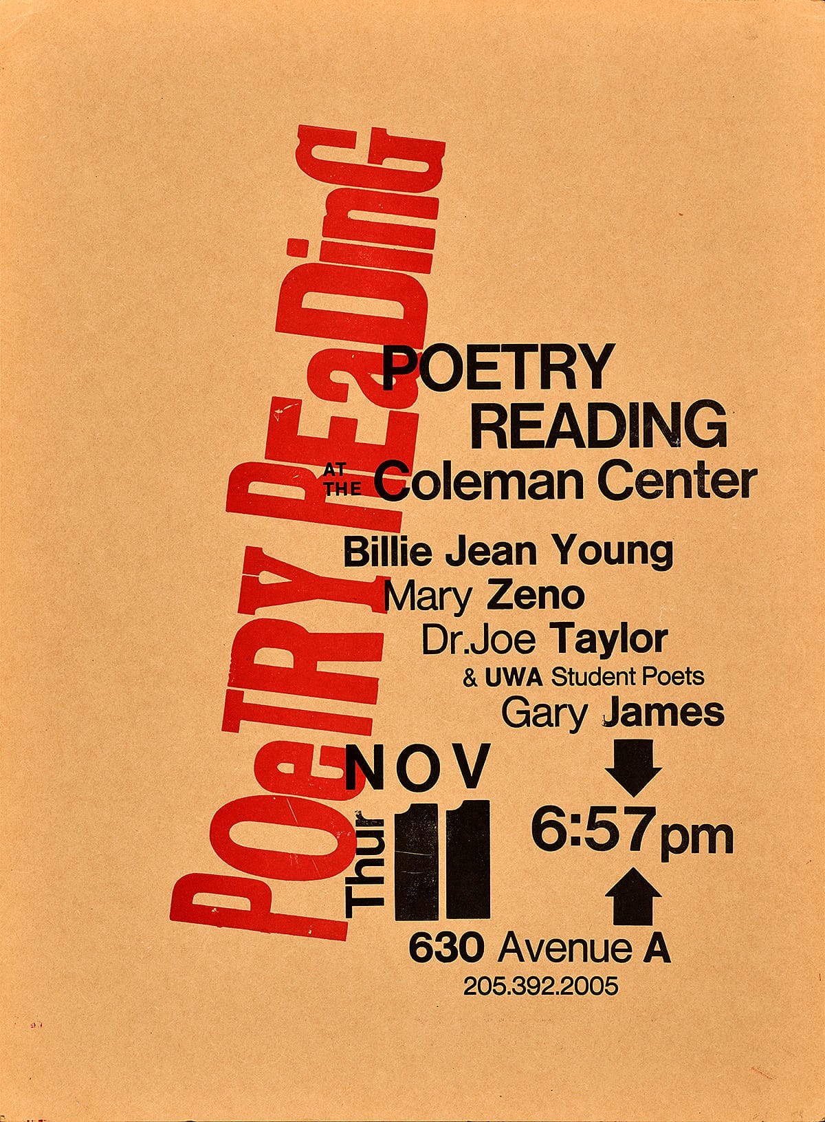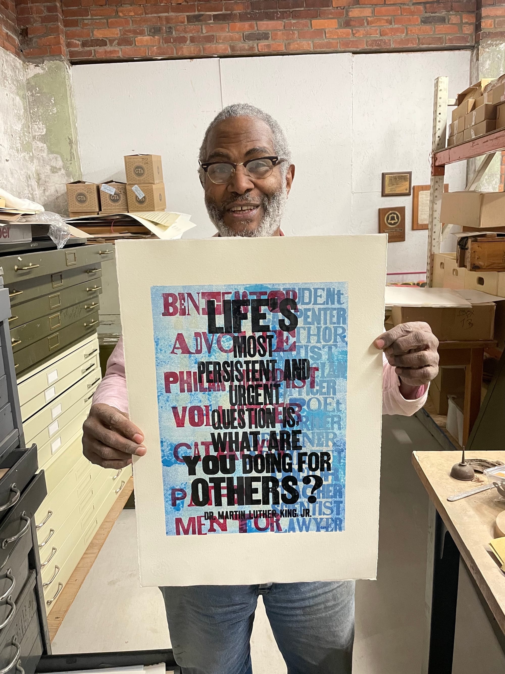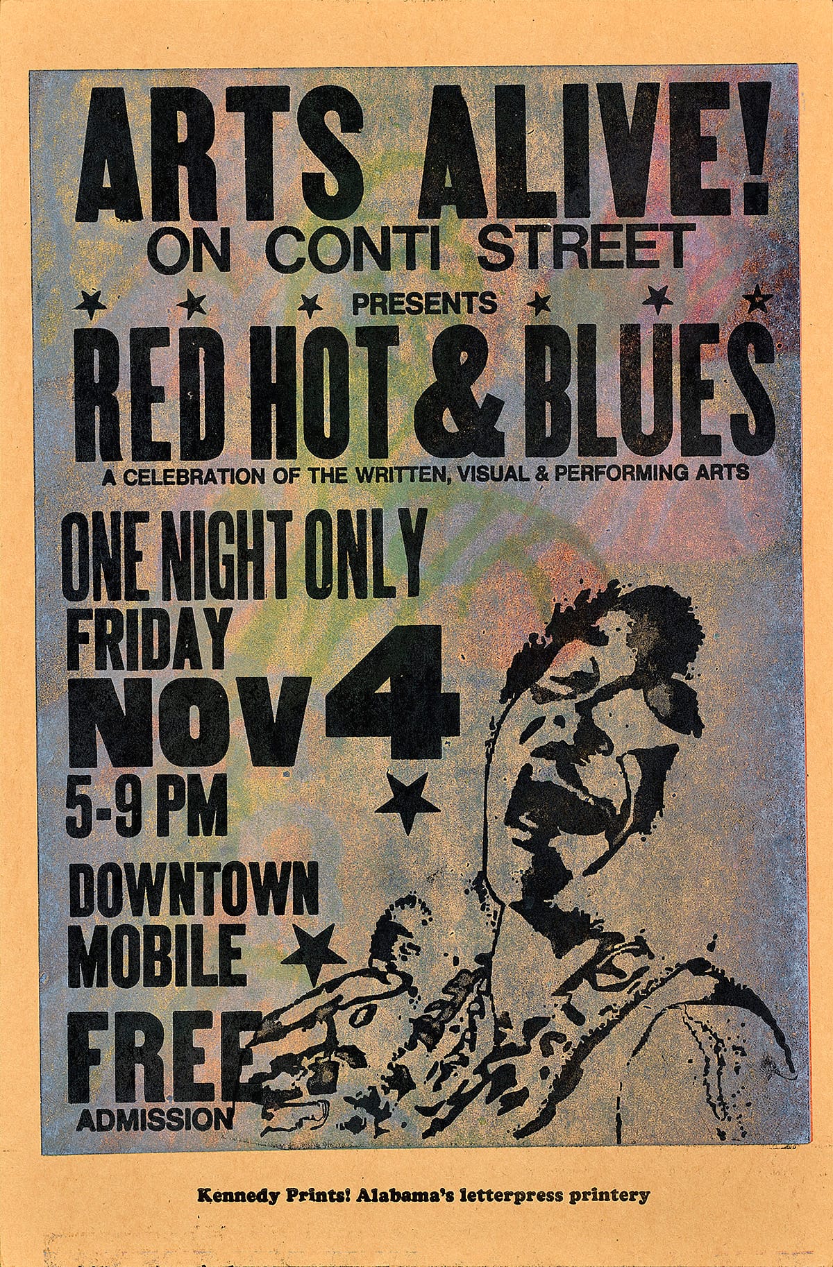 After 20 minutes in his archive, I knew I had been introduced to something unique. Posters in general are not often saved. They are meant to be pasted to walls and stapled to telephone poles, rained on, splashed with mud, and destroyed. So any poster that survives is a small miracle. More importantly, the posters that do survive are typically lithographs that were mass-produced for urban centers, places with a large amount of public wall space and a need for advertising. Amos’s posters are the opposite. They are printed via letterpress, a process perhaps best known today for making cute stationary on Etsy. Each piece in a single print run is slightly different, the colors changing as Amos adds new ink. Decades ago, letterpress printing was part of every town’s local visual language — a means of regional communication where large lithographic printing would have been expensive and unnecessary. Amos taps into that intimacy by reviving the practice, mixing vintage and new wood and metal type into layered, eye-catching designs meant to impart information. Much of his early poster work is also the only documentation of certain events in Alabama, particularly Black community gatherings.