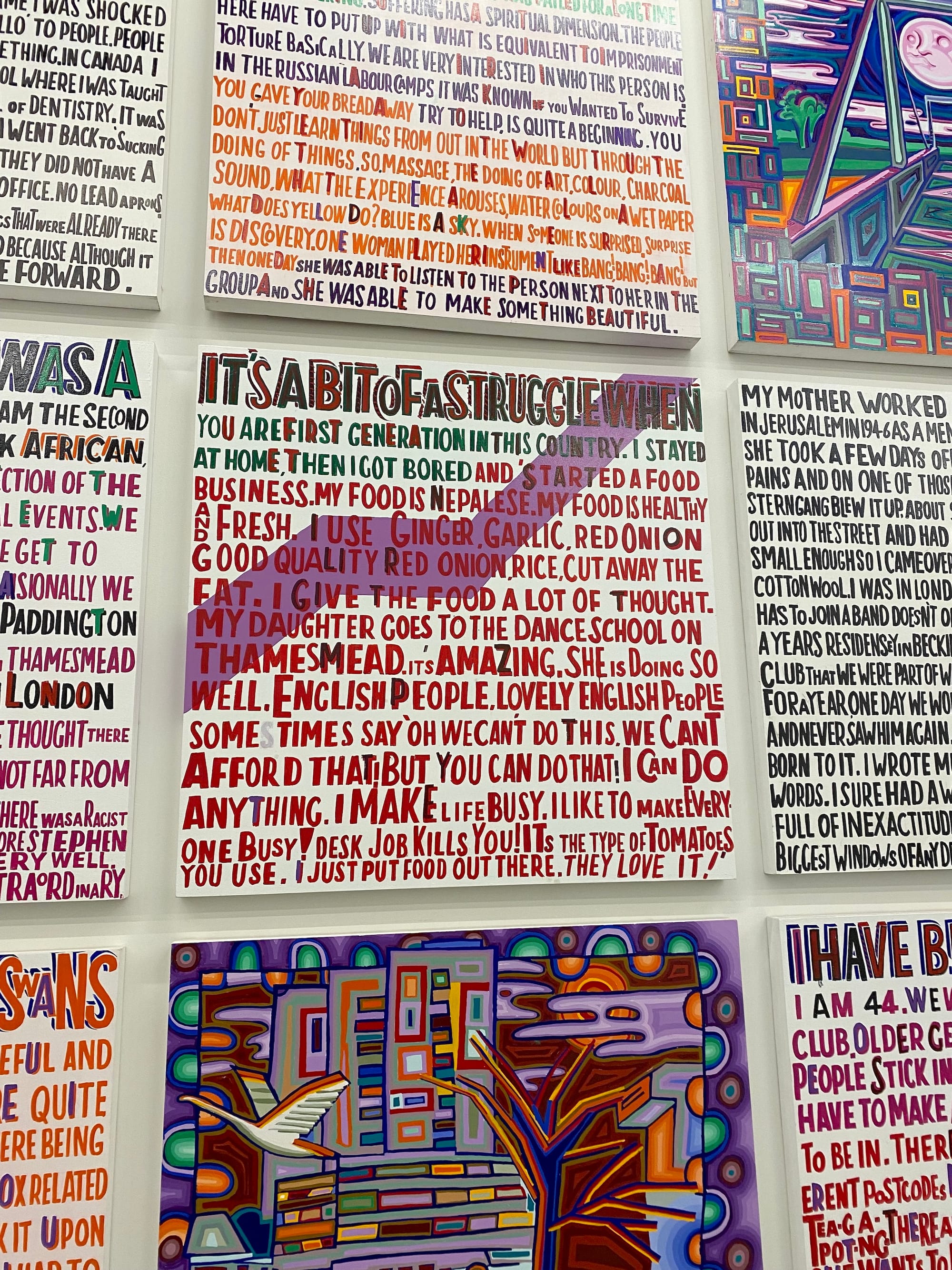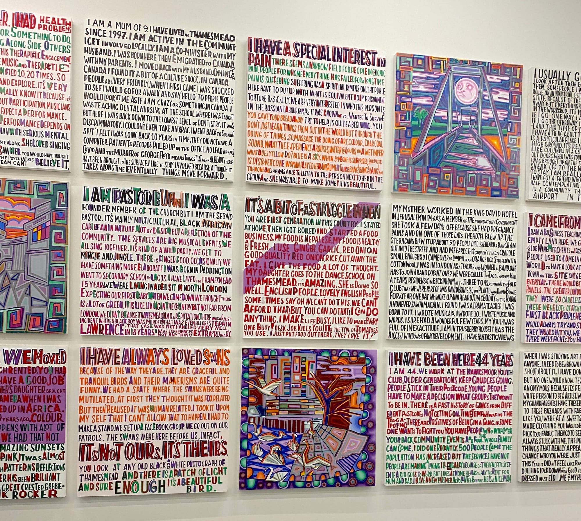 She’s right, and it’s there for a very good reason, I soon discover. The Thamesmead Codex consists of 16 panels painted with words and a smattering of images, all neatly hung together on a corridor wall in groups of four. It faces the bridge that carries you over the Turbine Hall from the Natalie Bell building to the Blavatsky Building. So, it’s not in a gallery but at an intersection, rather as if it were usually on the move and had paused only to take a breath. That feels just right.