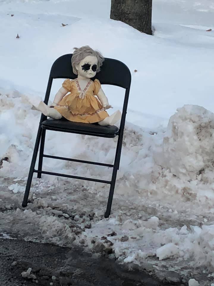 Lately, a Facebook Group has also sprung up for people reporting “dibs.” This year, Sheila Stockert Wheatley posted a photo of a creepy doll on a folding chair that someone put out as a kind of parking scarecrow. Another person snapped a photo of a tableau of two laundry baskets with a grey mannequin in between them, which commentators called “art.”