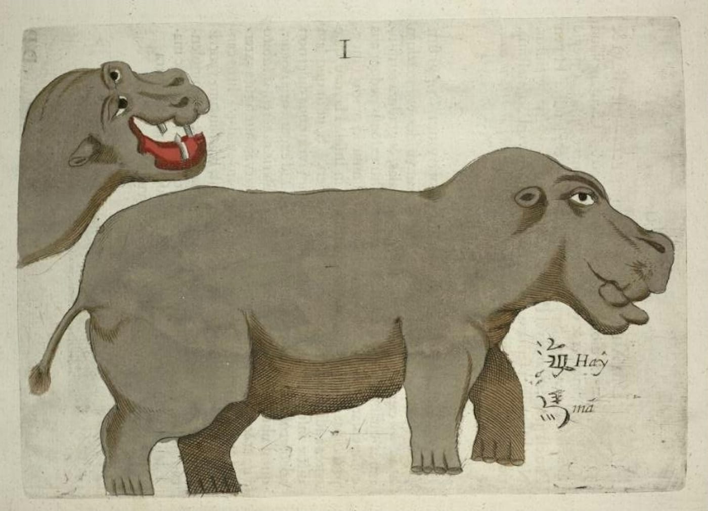 This bizarre representation of two hippos comes from Michal Piotr Boym, a Polish Jesuit missionary who traveled in Mozambique in the 1640s. Perhaps the deformed nature of his strangely charming hippos is due to the fact that he drew them from memory after he settled in China. It’s difficult to determine why the African creature made it into Flora Sinensis (1656), Boym’s tome on Chinese plants and wildlife. But it’s just one of his many drawings that, while not entirely faithful to life, are nonetheless beguiling. I’d like to think that he would’ve delighted in drawing Moo Deng’s belly rolls.