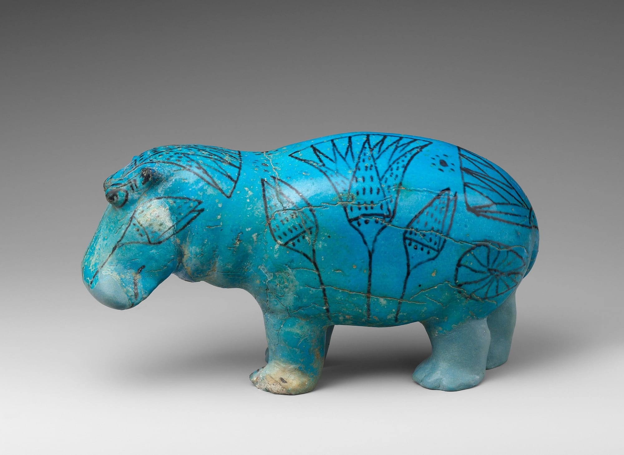During the New Kingdom epoch (c. 1550–1070 BCE), hippos were associated with the fearsome and sometimes evil god Seth. But in the time of the Middle Kingdom some two hundred years earlier, characteristics such as hippos’ habit of diving beneath the water for minutes at a time and emerging gloriously again earned them a different meaning: new life. This is the era of “William,” the bright blue ceramic statue that acts as the unofficial mascot of the Metropolitan Museum of Art. Decorated with lotus plants, which also symbolize rebirth, William measures just under five inches tall (~11.3 centimeters). His legs, now restored, may have been originally broken off to prevent him from attacking the person with whom he was buried. Perhaps artists rendered hippos like William as endearing for a similar purpose: to disarm their own fear.