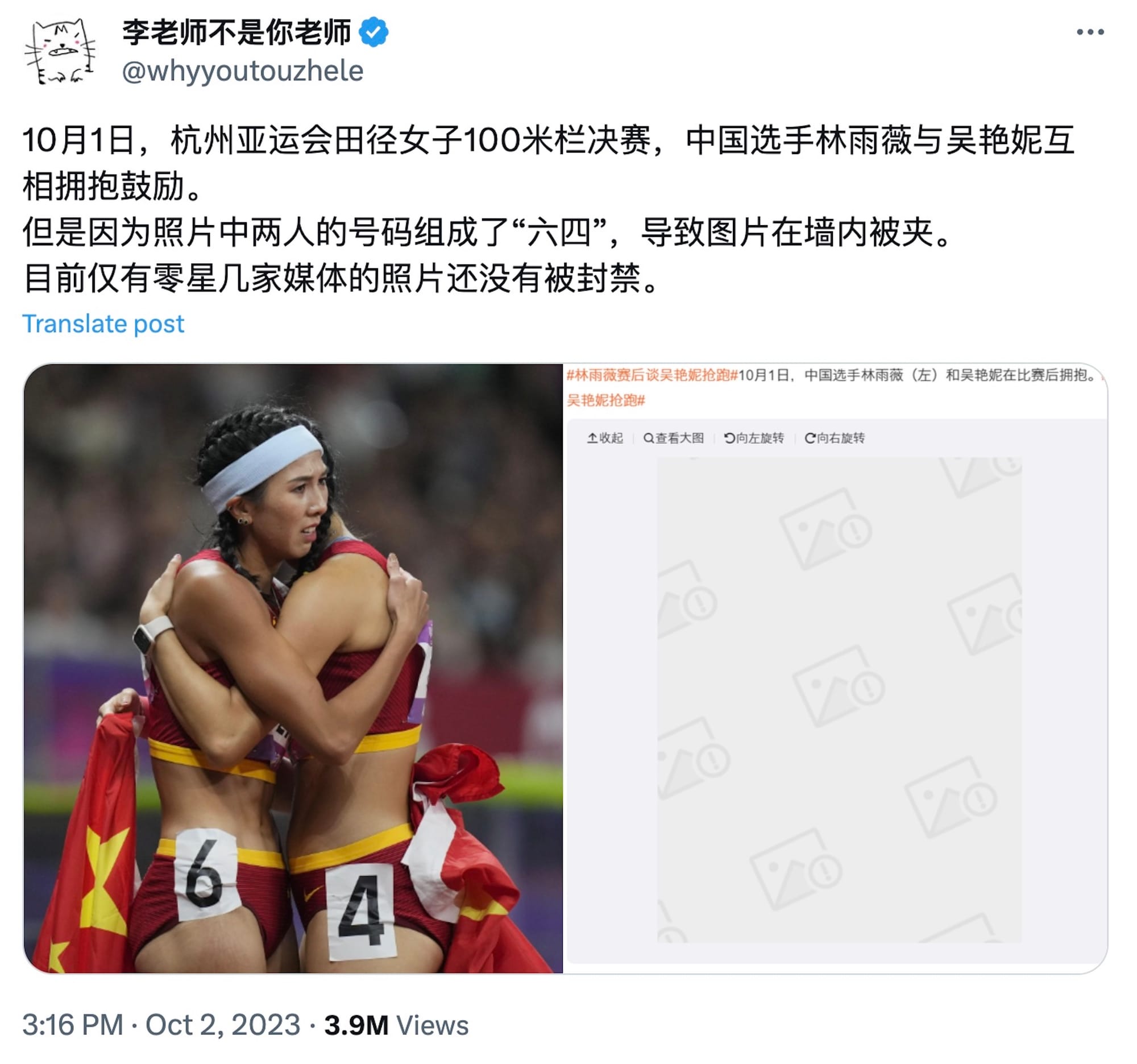 A widely shared photograph of two Chinese track athletes sharing an embrace after a race has been scrubbed from Chinese social media, reportedly because of an inadvertent reference to the 1989 Tiananmen Square massacre.