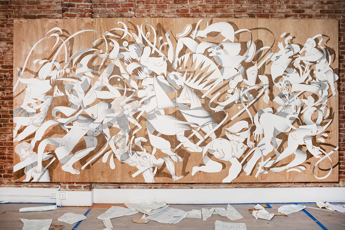 As the show’s title suggests, Rodriguez-Warner traffics in the artistic practice of leaving no bit of surface undecorated, and so he crams canvases with a mish-mash of imagery and bottomless nods to art history. A piece may start as a reclining nude, a hummingbird, or one of the violent battle scenes he favors concocting, but it could end up a swirl of allusions to everyone from Michelangelo to Matisse to Yoshitoshi, and everything from graffiti to comics to Japanese animation.