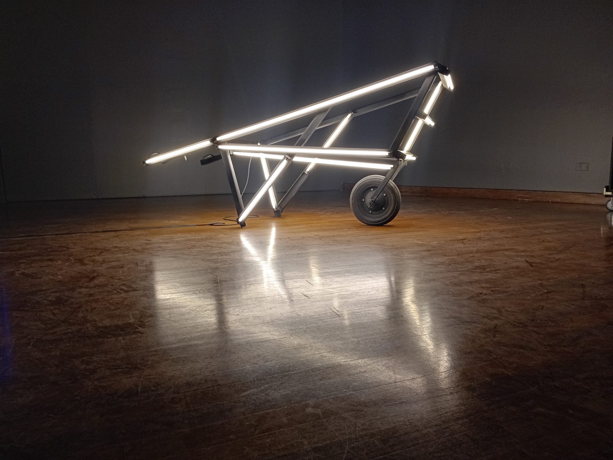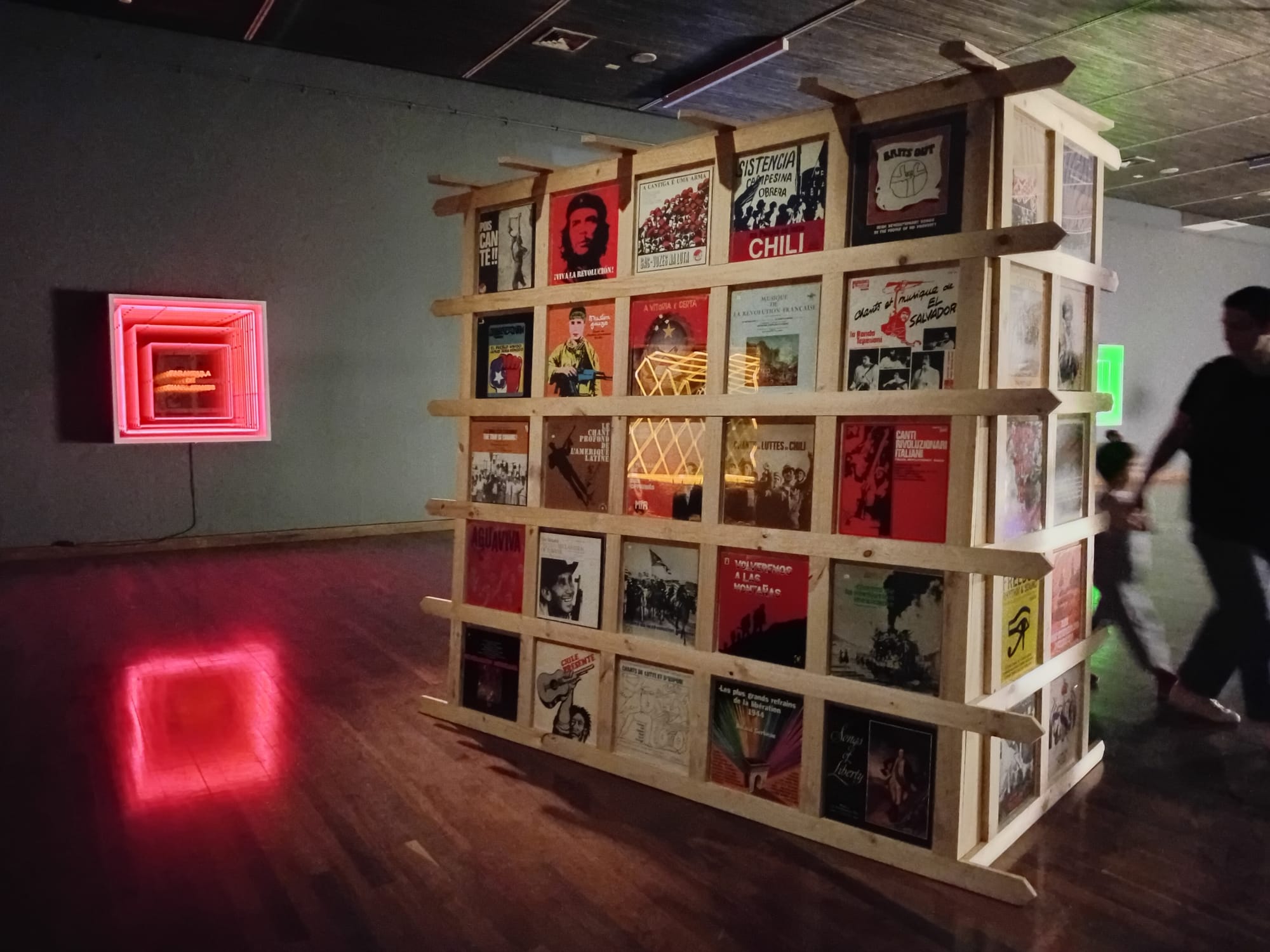 What makes the project especially poignant are the ways in which Hueso is reinscribing histories suppressed by authoritarianism. In the early years of the dictatorship, the hulking structure that houses GAM — a weathered steel building resembling an aircraft carrier — functioned as the headquarters of the military junta. Since 2010 it has served as a cultural center. In late October, one of its galleries became an improvised underground nightclub where María José bounded about the stage in an exuberant ensemble of sequins, tulle, and red fishnets, plunging into the opening lines of “Armenia,” a trumpet-laden tune bearing Arab influences. Neon sculptures by Navarro cast a red and green glow on the restrained gallery crowd, which, as the show wore on, was moved to dance. It was thrilling and joyful — art finding a way to outlast those who attempt to suppress it.
