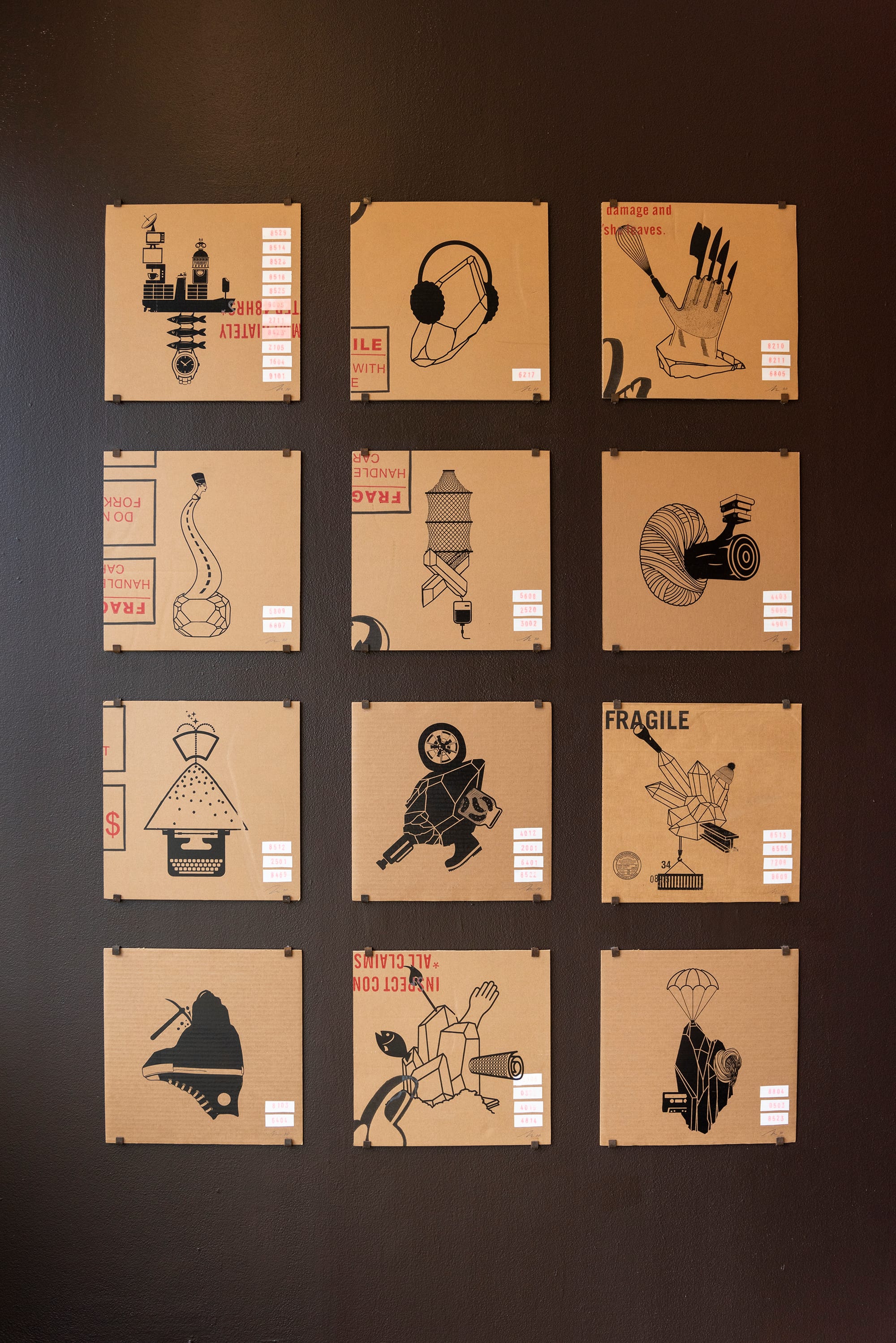 These modes converge with élan in the analog minimalism of Zurkow’s cardboard silkscreen grid, “Accretions” (2016). Each square panel depicts wry amalgams of natural and human-made objects, such as a crystal shard with earmuffs or a geode dangling from a parachute with a cassette tape jutting out from the rock. The fanciful object combinations loosely resemble plastiglomerates, a term coined in 2013 by scientists Patricia L. Corcoran and Charles J. Moore, and artist Kelly Jazvac, to refer to stones comprised of organic materials held together by melted and hardened plastic debris. The difference is that Zurkow’s artistic compounds have far more visual appeal than actual plastiglomerates, which look like geochemical hairballs coughed up by an unwell planet.