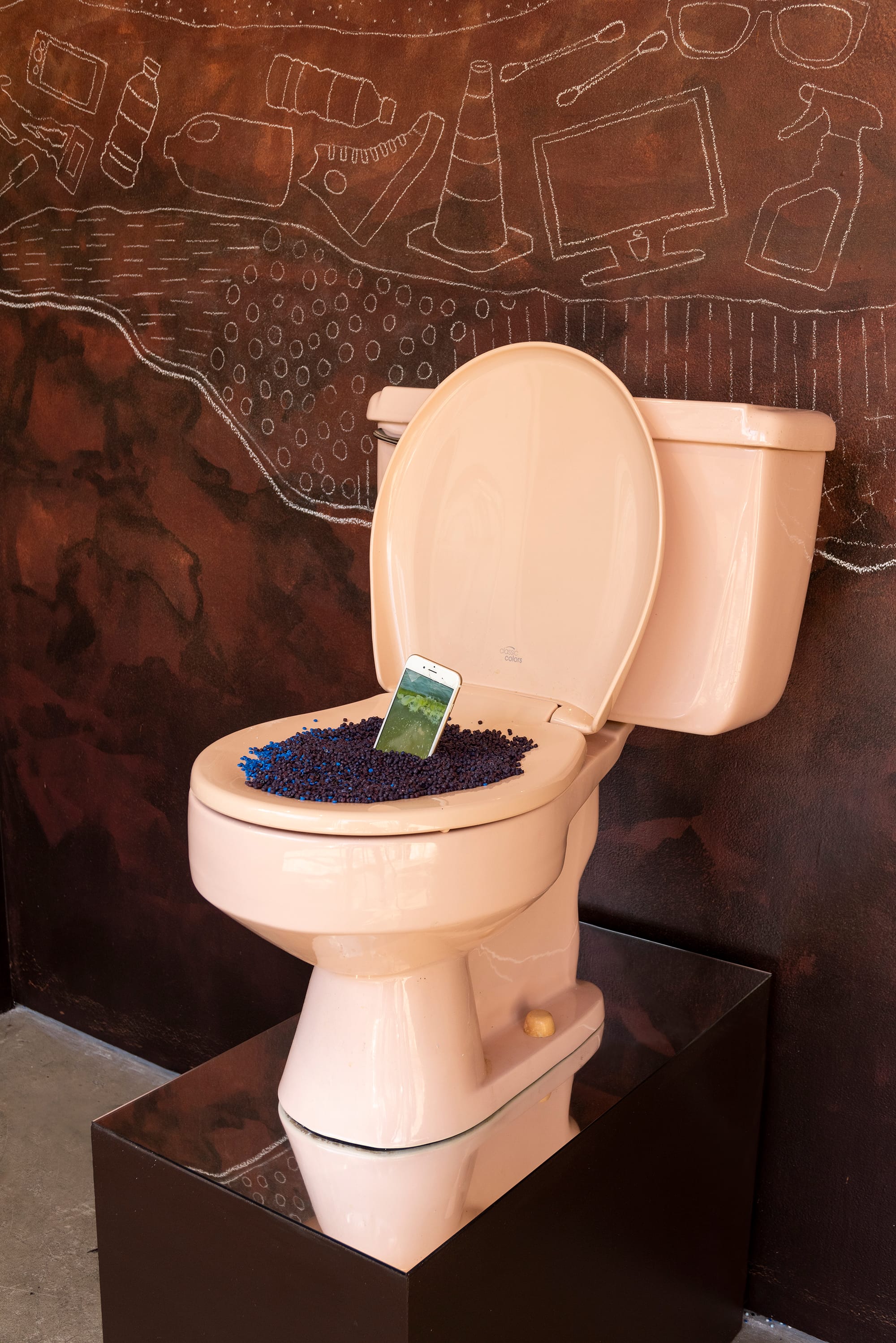 From behind bitforms gallery’s glass facade, an artistic toilet bowl (“Toilet Joke I,” 2020) beckons passers-by into Wet Logic, Sarah Rothberg’s and Marina Zurkow’s digitized meditation on water’s unearthliness. The readymade ceramic toilet’s most noticeable feature is its bowl, which brims with blue and brown recycled plastic pellets; nestled in the pellets is an iPhone whose cracked screen plays footage of waves lapping against a sandy shore. The joke, as it were, is on all of us: our species’ synthetic waste clogs the septic device we use to dispose of our bodies’ natural waste. On the brown-painted wall behind the toilet is a white chalk drawing in which consumer goods occupy one layer of the planet’s sedimentary record — it emphasizes how humans are hoisting ourselves with our own petrochemical petard.