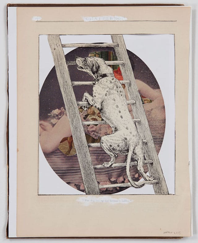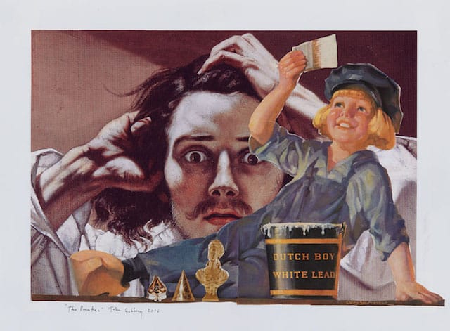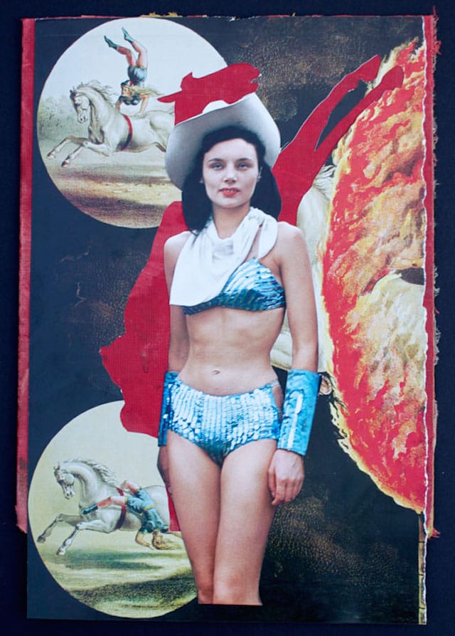 At a time when the art world’s nattering nabobs of positivity seem enthralled with lavish materials, production costs, price tags, auction records and other boorish spectacles, I find it refreshing to see work that requires little more than a pair of scissors, a pot of glue, paint brushes and gouache. As for materials, how about old book covers, used paperbacks, faded postcards, reproductions of famous and not-so-famous works of art, and vintage celebrity photographs — stuff found at flea markets and dusty, secondhand stores.