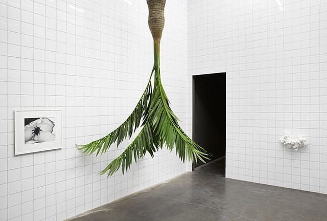The room contains a white, wall-mounted ceramic; a digital print on metal, Perspex and cardboard that resembles a vinyl LP; an upside-down plastic palm tree that recalls Natalie Jeremijenko’s “Tree Logic” in the courtyard of MASS MoCA; a framed black-and-white reproduction of Gustave Courbet’s “The Origin of the World” (might we call for a moratorium on the appropriation of that image?) with a strategically placed tarantula; and a white cage housing lifelike mechanical birds.