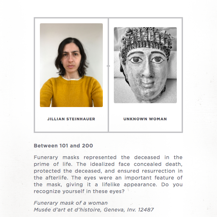 Drawn from the collections of Geneva’s Musée d’art et d’histore and Fondation Gandur pour l’Art, the 52 faces from antiquity that up for match are all Greco-Roman and Egyptian — which means a Southeast Asian gal like me is a sure-fire loser for the lookalike contest. But as an assiduous journalist bent on investigating the competence of the technology, I nevertheless uploaded my selfie to test the Betaface API service. It analyzed 123 landmark points on my visage before informing me that I resemble the funerary mask of a Roman “Unknown Woman,” which actually does bear a similar hairstyle to me (and impressively also sports a hair clip).
