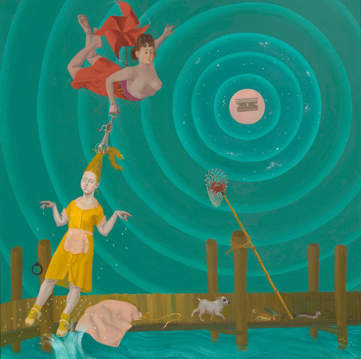 The eye is drawn around “Reception” by the rich details of the partygoers below, an ornate crystal chandelier above, and the surreal presence of live birds roosting atop the lighting fixture and on people’s heads. But the entire middle of the painting consists of the empty space of the background wall. There is a real oddity to Sharrer’s compositions — the horizon is often pushed awkwardly high or low, defying the rule of thirds at every turn. Her knack for extraordinary detail and inclusion of eye-catching and surreal elements force the viewer’s gaze to move everywhere — there are no simple pathways through her work. Sharrer draws the viewer into a complicated visual conversation; perhaps it is projection to note that complexity is another quality rarely championed in women. There’s nowhere for the eye to rest in her paintings; they require exceptionally active viewing and, like most “difficult” women, refuse to let the viewer off easily.