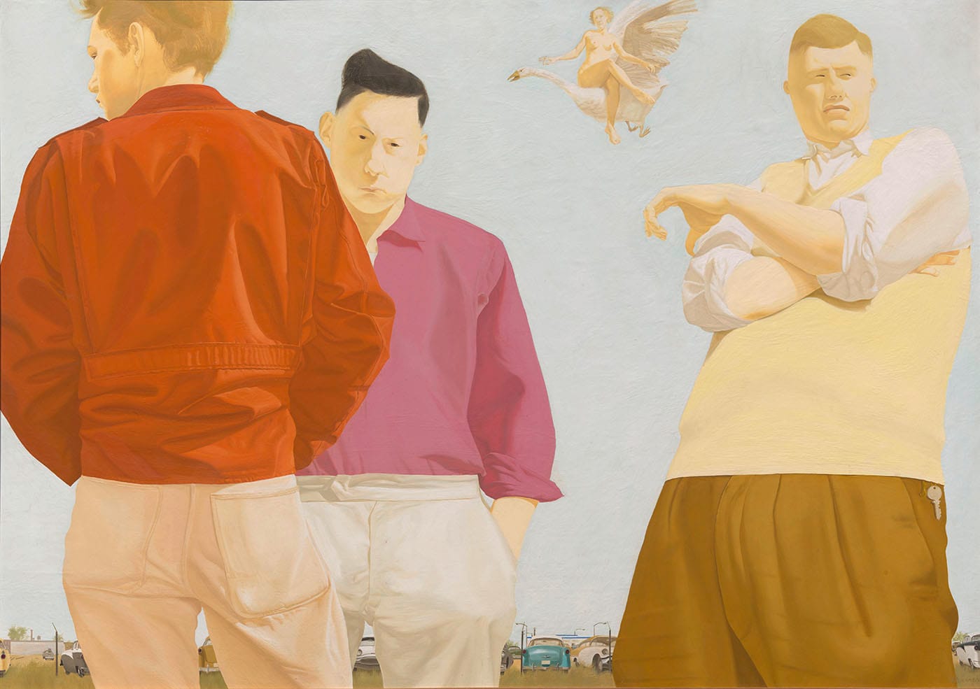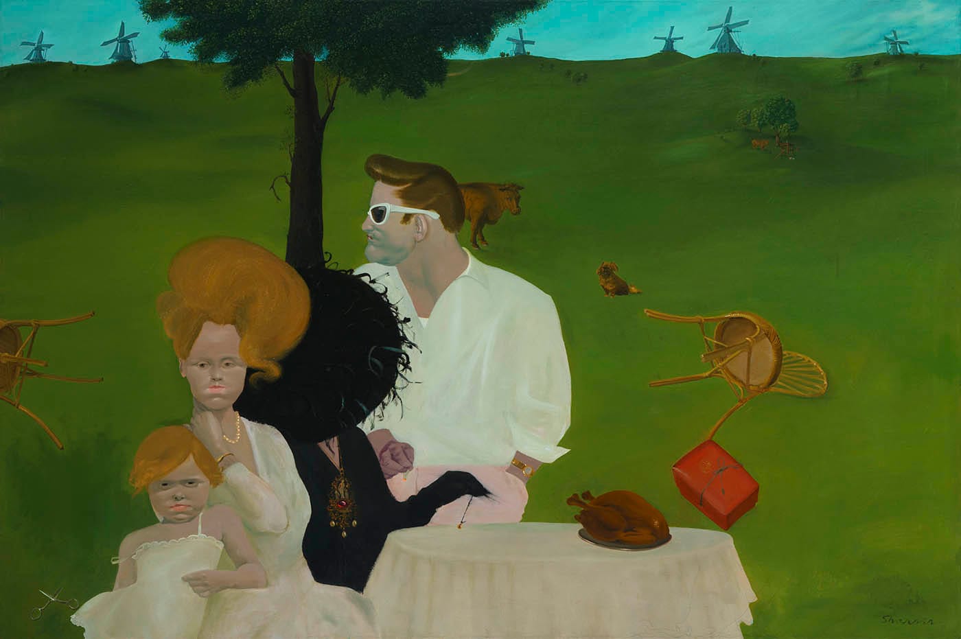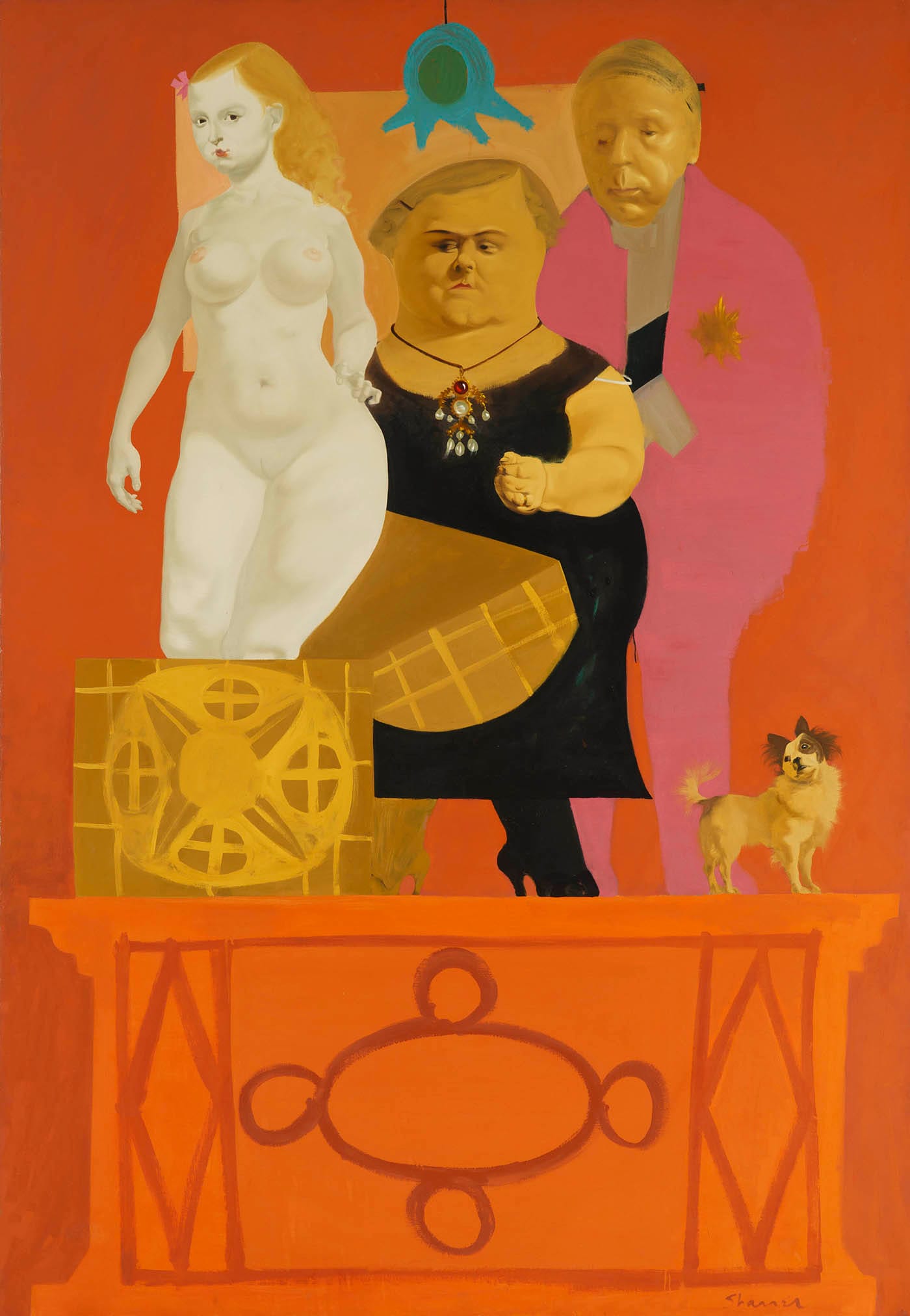 At the onset of the 1960s, Sharrer adopted some Pop art elements in her work, while continuing to cultivate her surreal subject matter. At this point, a clear visual vocabulary emerges: lap dogs, melting cutlery, lit cigarettes, and cuts of meat form a recurring motif of dreamlike symbolism, in landscapes inhabited by circus folk, mythical creatures (Leda, of swan fame, is a regular), solemn children, and round-faced, nude, frankly unapologetic women who gaze directly at the viewer.